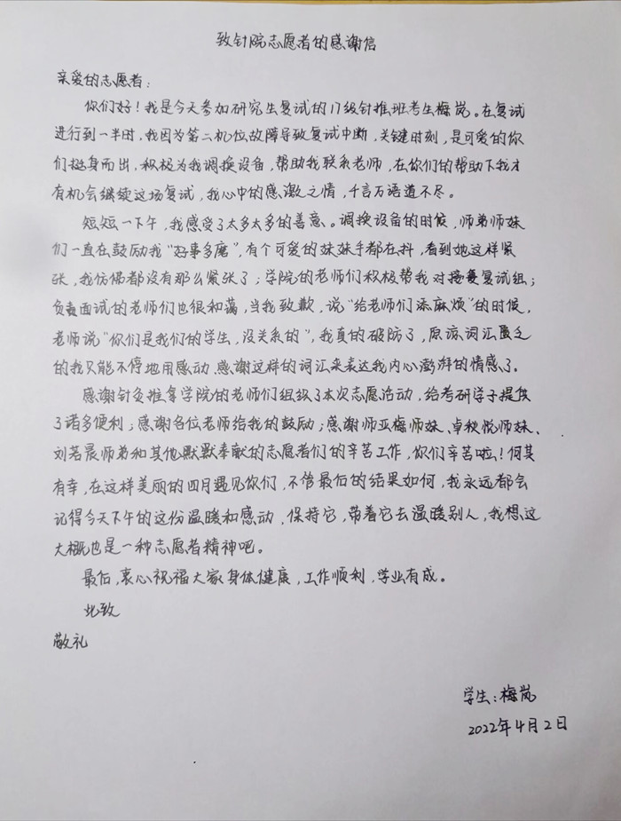 近日一封手写的感谢信送到我校针灸推拿学院的志愿者手中,“我心中的感激之情,千言万语道不尽”“我只能不停用感动、感激这样的词汇来表达我内心澎湃的心情了”在这封感谢之情溢于言表的感谢信中,参加本次线上复试的考生对志愿者们热情服务、默默付出的精神和切实且迅速解决考生问题的行动表达了衷心的肯定和感谢。