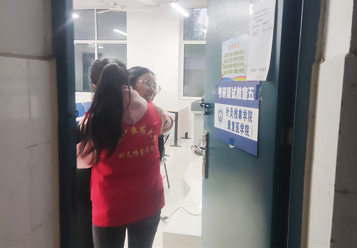4月2日下午,仲景楼204第五复试教室的考生梅岚,在复试进行一半时第二机位因故障导致复试突然中断,关键时刻,在取得考官们谅解后,志愿者卓秋悦、师亚梅、刘若晨三位志愿者挺身而出、迅速行动,帮助考生调换设备,成功解决问题,顺利完成了接下来的复试!复试结束后,梅岚紧紧拥抱志愿者,向大家表示感谢,并和各位志愿者分享了自己的考研经历和经验,相互促进共同成长。