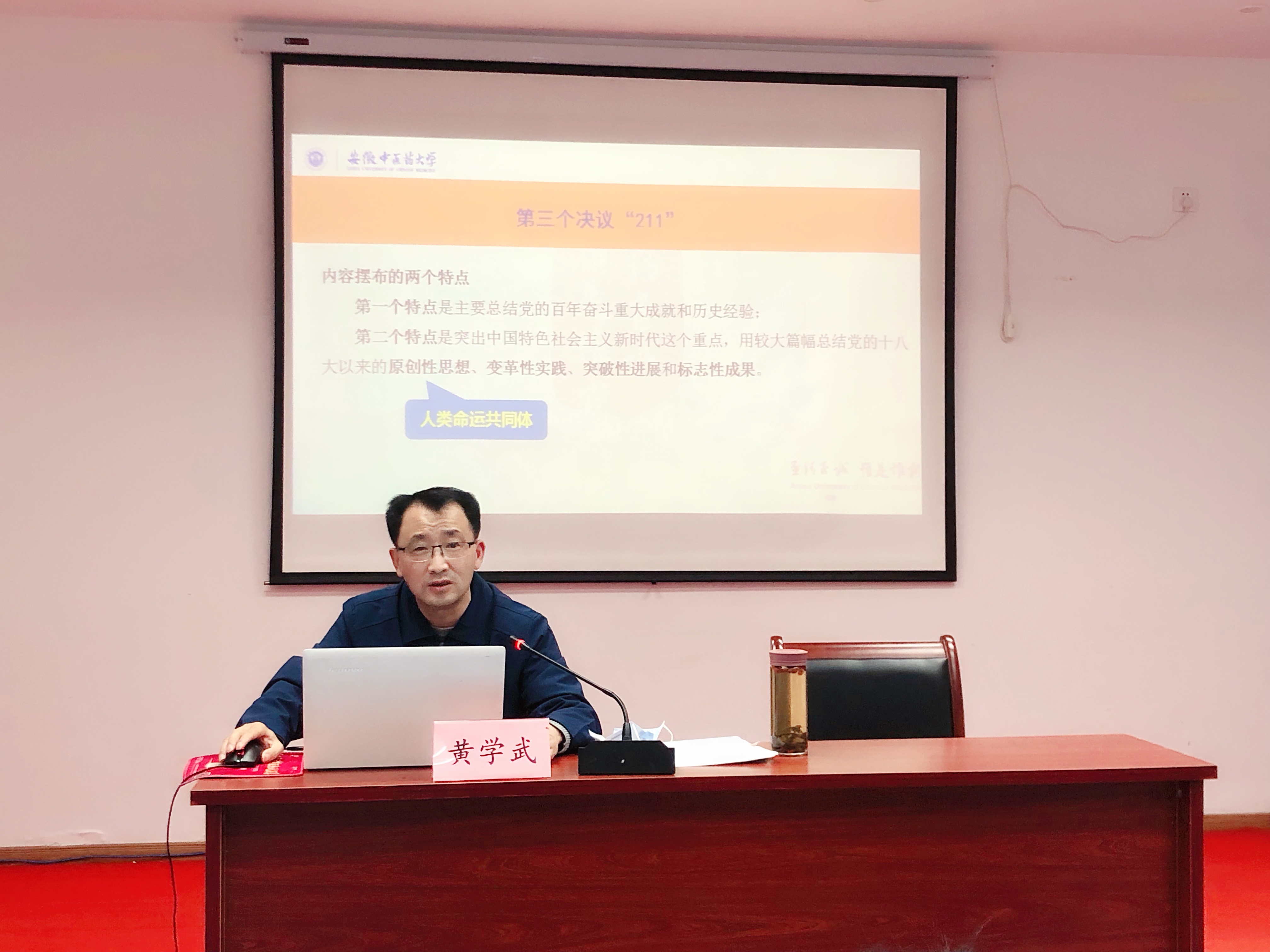黄学武以百年党史三大决议的重大意义为开端,从党的十九届六中全会的重大意义、中国共产党百年奋斗的重大成就、中国共产党百年奋斗的历史意义、中国共产党百年奋斗的历史经验及中国共产党实现第二个百年奋斗目标必须坚持的基本遵循五个方面对党的十九届六中全会精神进行深刻剖析。