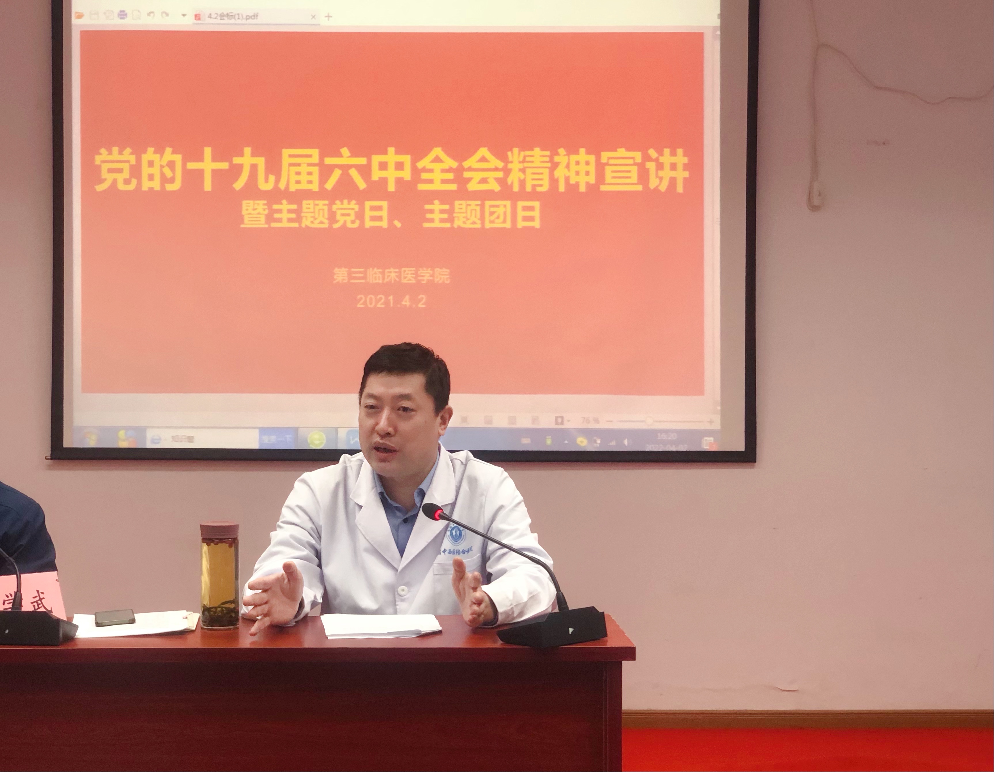 为深入学习贯彻党的十九届六中全会精神,切实引导医院广大医护职工把思想和行动统一到党的十九届六中全会精神上来,按学校统一部署要求,4月2日,第三临床医学院召开党的十九届六中全会精神宣讲暨主题党日、主题团日活动,特别邀请了学校理论宣讲团成员、马克思主义学院党总支书记黄学武作题为《全面总结党的百年奋斗重大成就和历史经验》的宣讲。医院领导班子参加会议。医院党委副书记、院长韩永升主持会议。