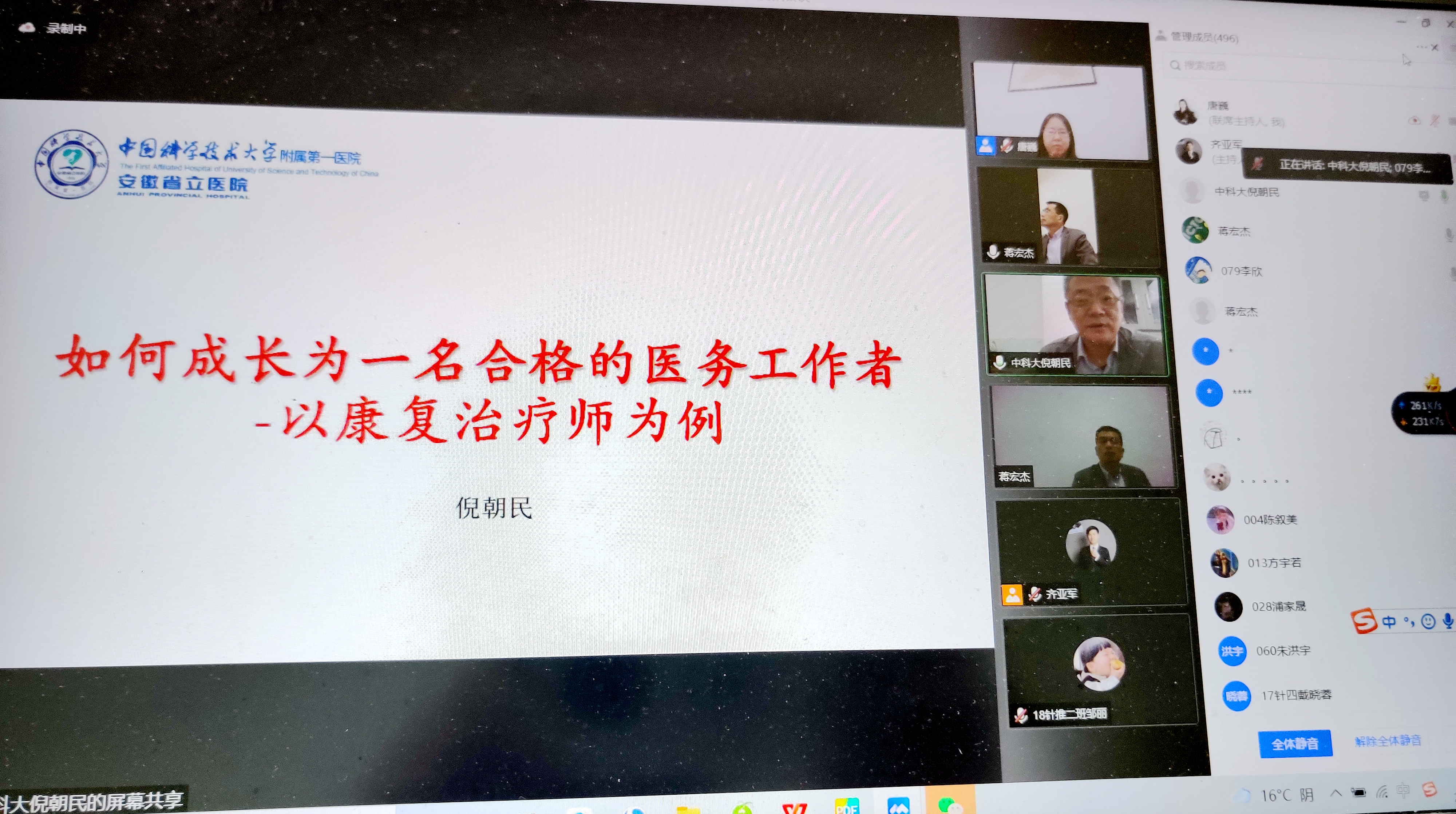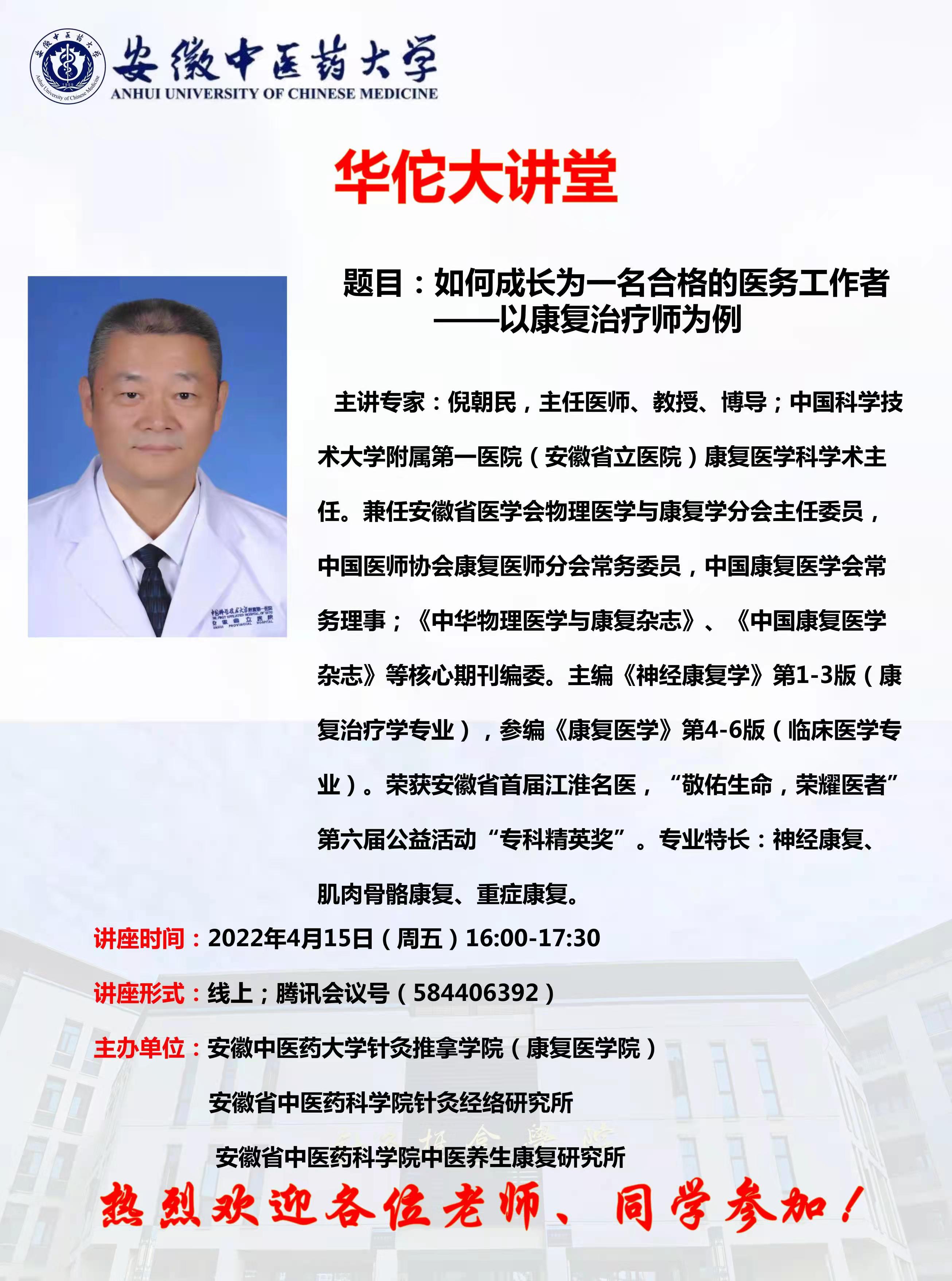 4月15日下午,针灸推拿学院(康复医学院)主办的 “华佗大讲堂”学术活动首场开讲,讲座邀请中国科学技术大学附属第一医院(安徽省立医院)康复医学科学术主任、安徽省医学会物理医学与康复学分会主任委员、学院外聘就业导师倪朝民教授以《如何成长为一名合格的医务工作者——以康复治疗师为例》为题精彩开讲。学院党政领导、“杏林匠心”工作室全体辅导员、“全国党建工作样板支部”教工第一党支部、在读学生500余人云端相聚,参会聆听。讲座由学院院长唐巍主持。