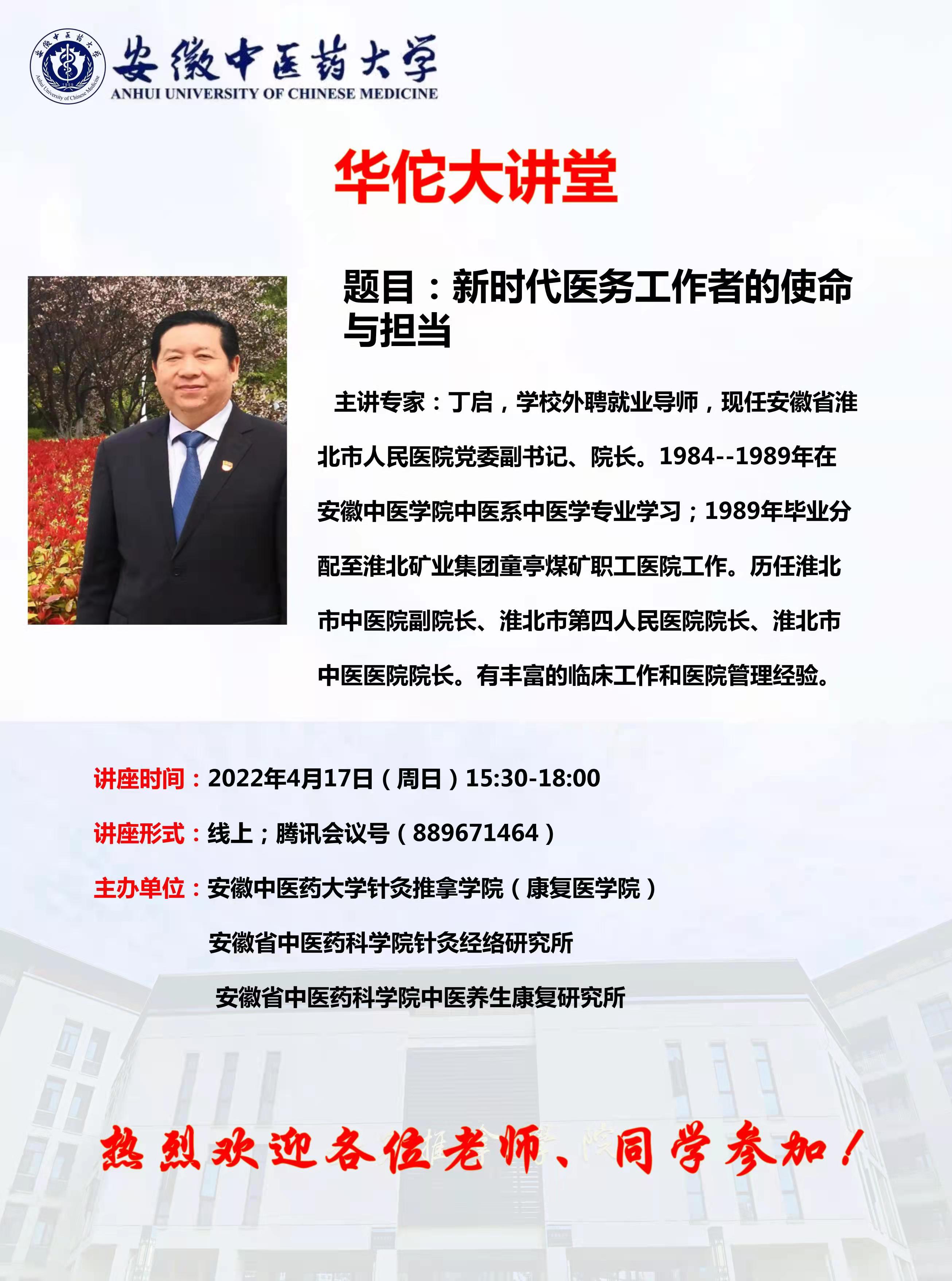4月17日下午,针灸推拿学院(康复医学院)举办第二期“华佗大讲堂”,邀请淮北市人民医院党委副书记、院长、我校89届中医学专业优秀校友、学院外聘就业导师丁启以《新时代医务工作者的使命与担当》为题开展了线上讲座。学院党政领导、“杏林匠心”工作室全体辅导员、“全国党建工作样板支部”教工第一党支部、在读学生近300人再次相聚云端。学院院长唐巍主持讲座活动。