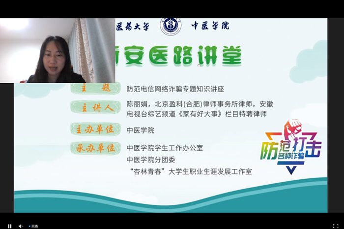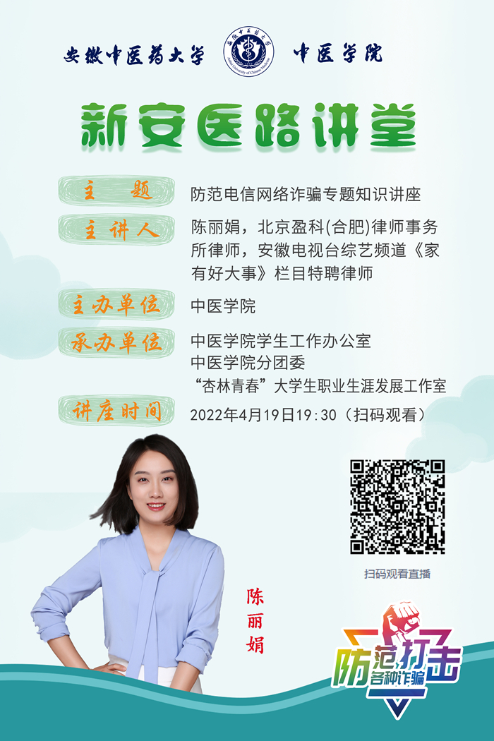 为进一步加强学院电信诈骗防范工作,切实提高学生的风险防范意识和应对处置能力,4月19日晚,中医学院邀请北京盈科(合肥)律师事务所专职律师、安徽电视台综艺频道《家有好大事》栏目特聘律师陈丽娟开展防范电信网络诈骗专题知识讲座,全体辅导员及学生参加。