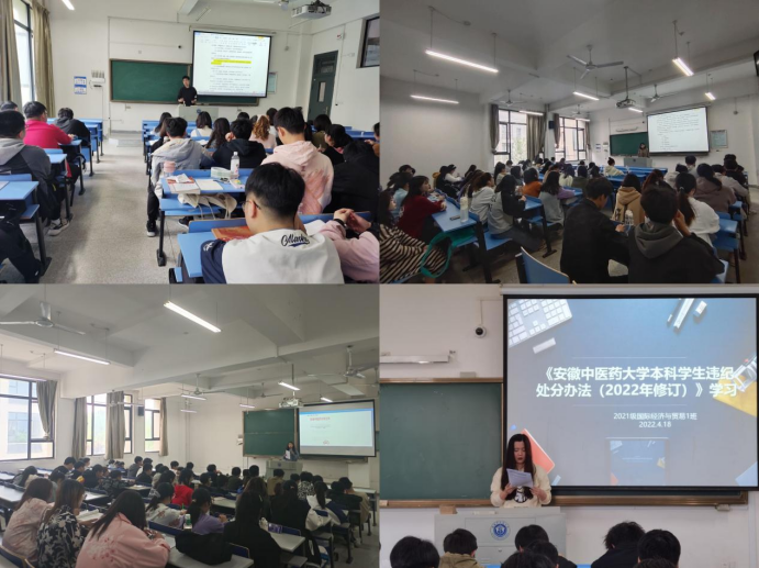 为进一步巩固和加强医药经济管理学院院风和学风建设,促进教育教学秩序和生活秩序更加有序、和谐,提升学生自我管理、自我教育、自我监督的意识和水平,4月中旬以来,学院以班级为单位召开主题班会,组织全院学生学习《安徽中医药大学本科学生违纪处分办法(2022年修订)》。主题班会由各年级辅导员组织召开。