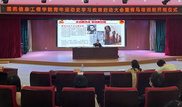 “喜迎二十大,永远跟党走,奋进新征程”,医药信息工程学院4月20日举行青年运动史学习教育启动大会暨青马培训班开班仪式。学院党委书记吴成海等出席,学院分团委负责人、辅导员及学院主要团学干部参加。