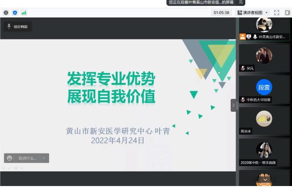 4月24日下午,黄山市新安医学研究中心办公室副主任叶青以“发挥专业优势,展现自我价值”为主题向中医学院毕业生开展就业指导讲座,云端讲解新安医学文化传播及相关产业发展前景,呼吁优秀毕业生发挥专业特长,投身新安医学文化传播与研究事业。学院党委副书记、班级辅导员、研究生及本科生200余人与会聆听。