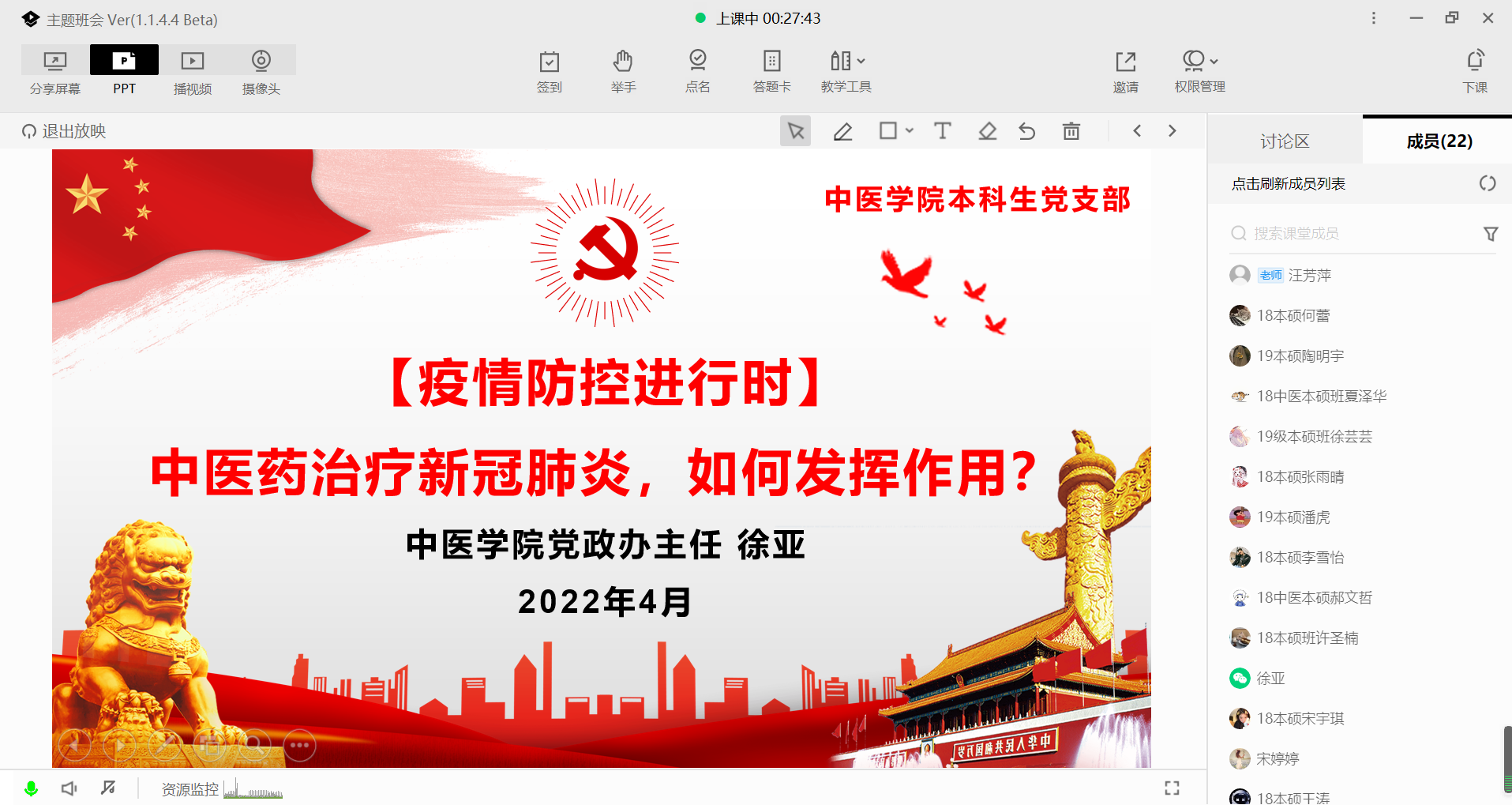 4月21日,中医学院本科生党支部利用线上方式举行“疫情防控进行时:中医药治疗新冠肺炎,如何发挥作用?”专题学习,本次党课由中医学院党政办公室主任徐亚老师主讲。