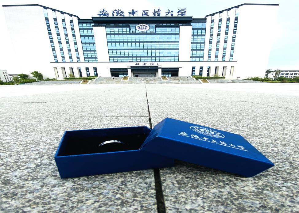 戒指的全身由钛钢打造,戒指外环印着安徽中医药大学的校徽和校名,戒指内环上雕刻着的学生的姓名和班级。大学时光如沙漏一般在指尖流逝,将姓名和学号镌刻在戒指上,让每一枚戒指都成为唯一,与药学院一起,勾勒出与母校独一无二的青春记忆,小小的戒指也承载了药苑的祝福:前途似海,来日方长,愿世间的美好与你环环相扣。