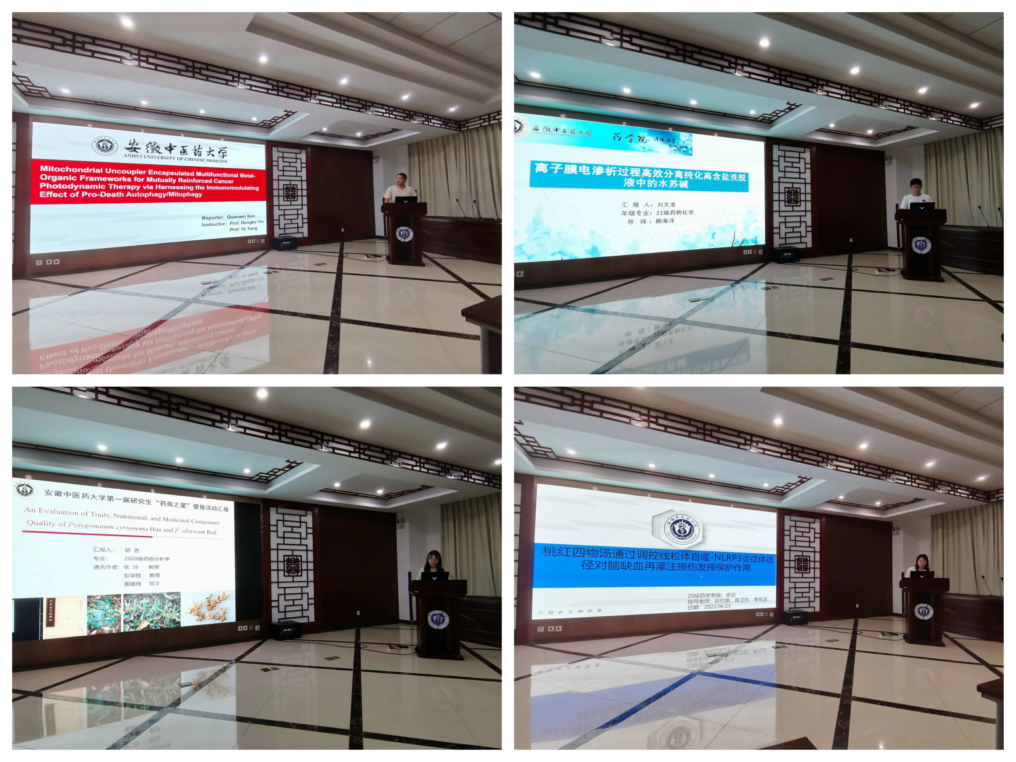 6月23日下午,安徽中医药大学第一届“药苑之星”研究生壁报大赛报告会在少荃湖校区沁馨堂成功举办。研究生院院长王鹏、药学院院长桂双英、药学院副院长尹登科莅临现场指导。