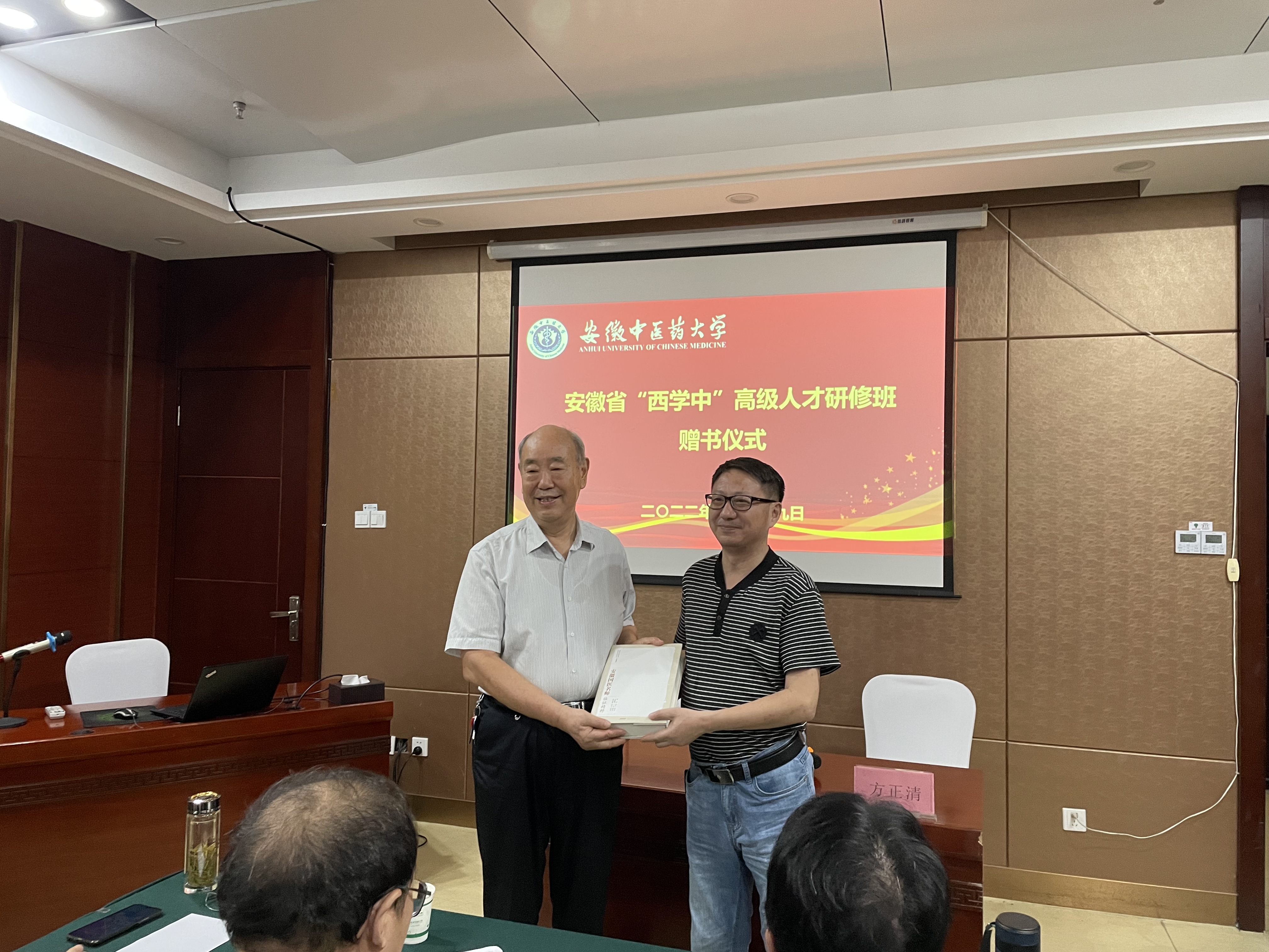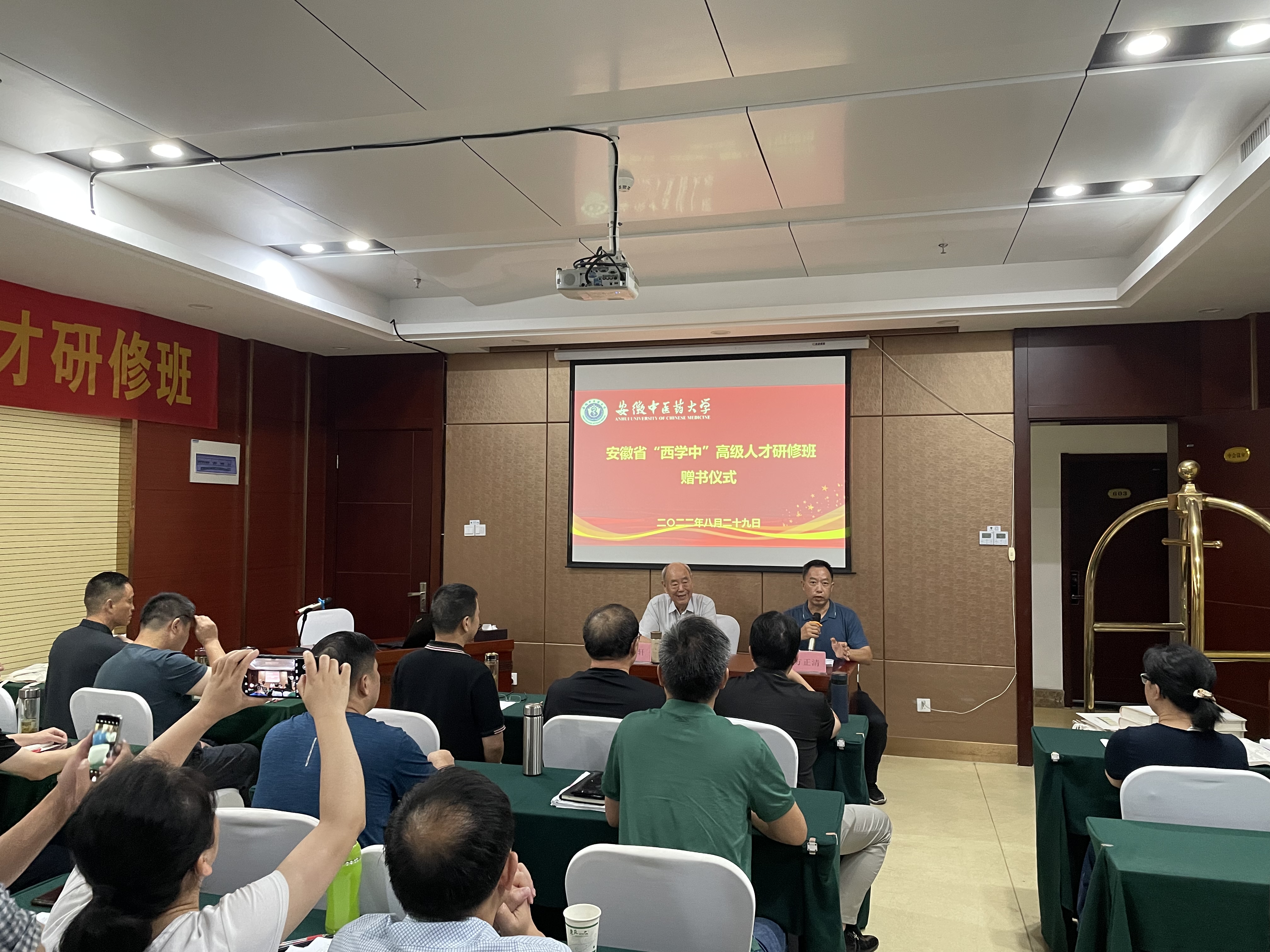 8月27日至9月4日,安徽省“西学中”高级人才研修班举行第四次集中面授。8月29日下午,国家级名中医、首届安徽省名中医、首届安徽省国医名师、安徽中医药大学第一附属医院主任医师、研修班培养对象指导老师周宜轩教授,将《安徽国医名师临证精粹》一书赠送给研修班全体学员,该书旨在弘扬中医药特色优势,深入挖掘名老中医临床经验,提升安徽中医药学术与临床水平,彰显安徽名老中医学术与经验特色。学校继续教育学院院长方正清出席并主持赠书仪式。