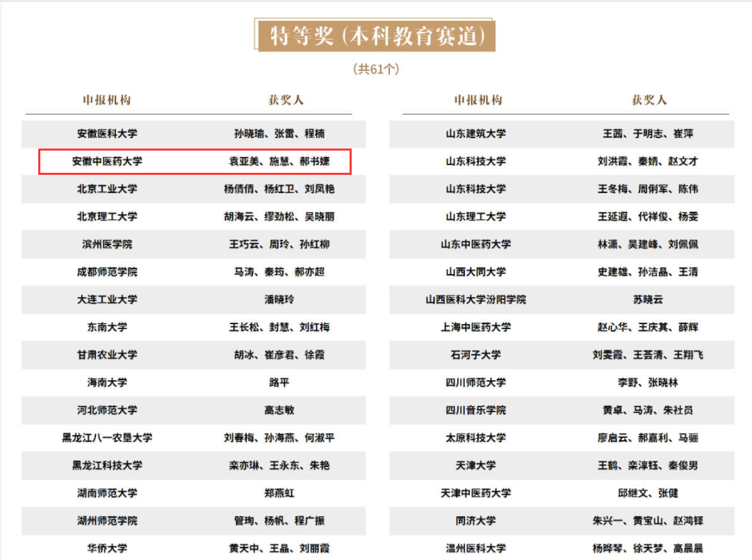 近日,第二届“智慧树杯”课程思政示范案例教学大赛获奖名单揭晓,护理学院袁亚美、李一芳团队分获本科教育赛道特等奖、二等奖,学校荣获最佳组织奖。这是近期学院在课程思政建设上继安徽省课程思政案例征集比赛所获佳绩(一等奖2项、二等奖1项、三等奖2项)之后,获得的又一殊荣。