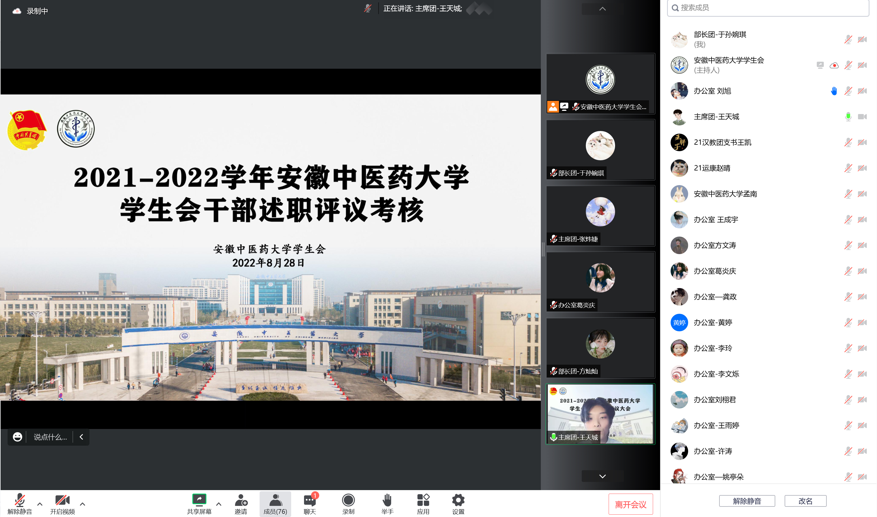 为深入贯彻落实《关于推动高校学生会(研究生会)深化改革的若干意见》等文件精神,加强学生会(研究生会)的组织建设,进一步深化校学生会(研究生会)改革,支持和引导学生会组织更好地服务青年成长成才,我校于8月28日、9月1日分别开展线上学生会、研究生会学生干部述职评议。校学生处、团委老师,部分学生代表及校学生会(研究生会)所有成员参加此次会议。