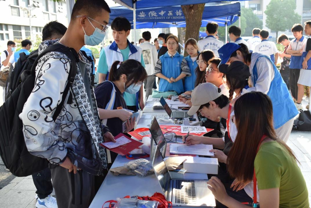 报到处,志愿者们逐一核验新生报到材料、发放宿舍钥匙、一卡通及新生大礼包。