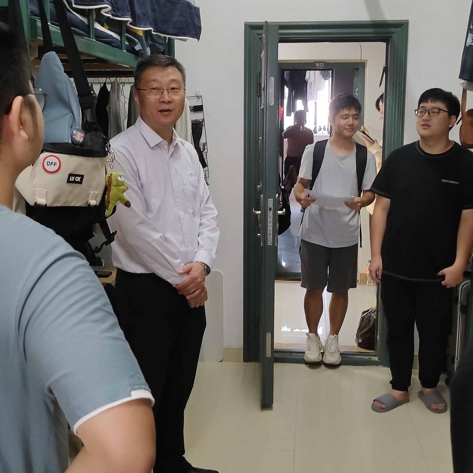 冯鑫对同学们的学习和生活表示了关心慰问,了解同学们的假期安排,对宿舍卫生、用水用电安全进行了检查,对发现的问题及时提出了整改意见,并就当前疫情防控工作做出提醒。面对高年级学生,他建议同学们做好职业生涯规划,先就业再择业,鼓励大家从基层做起,一步一个脚印踏踏实实打牢根基。针对即将到来的国庆假期,冯鑫希望同学们能够管理好自己,合理分配个人时间,注意疫情防控与网络诈骗,度过一个平安祥和的假期。