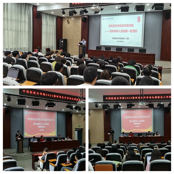 老生代表2020级中西医结合专业博士研究生郝文杰和新生代表2022级中西医结合基础专业硕士研究生王璐洁分别作了发言。开学典礼后,副院长王靓为2022级全体研究生作了题为“研究生科研诚信专题讲座—系好科研人生的第一粒纽扣”讲座。(中西医结合学院/文图 尹必武/审核)