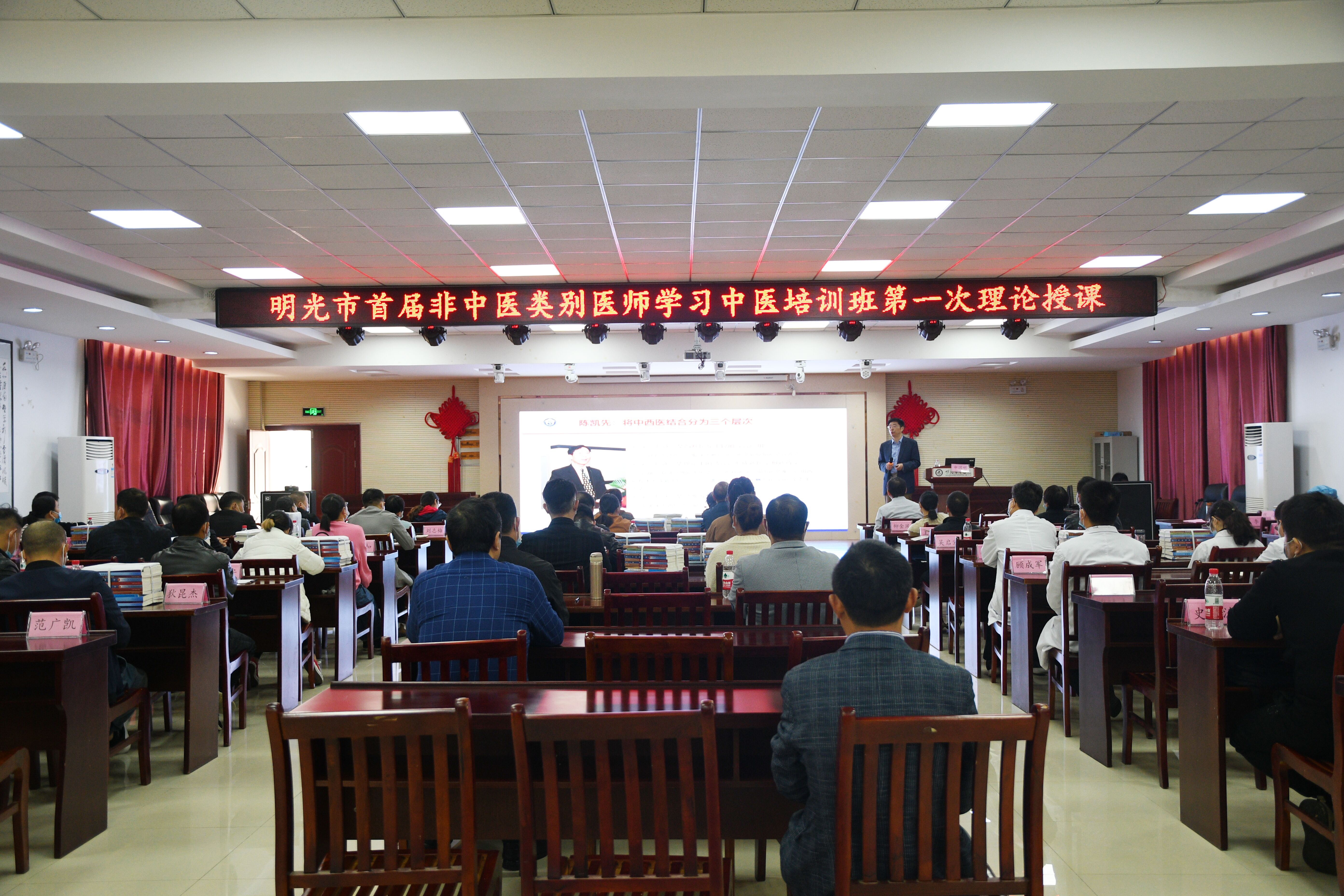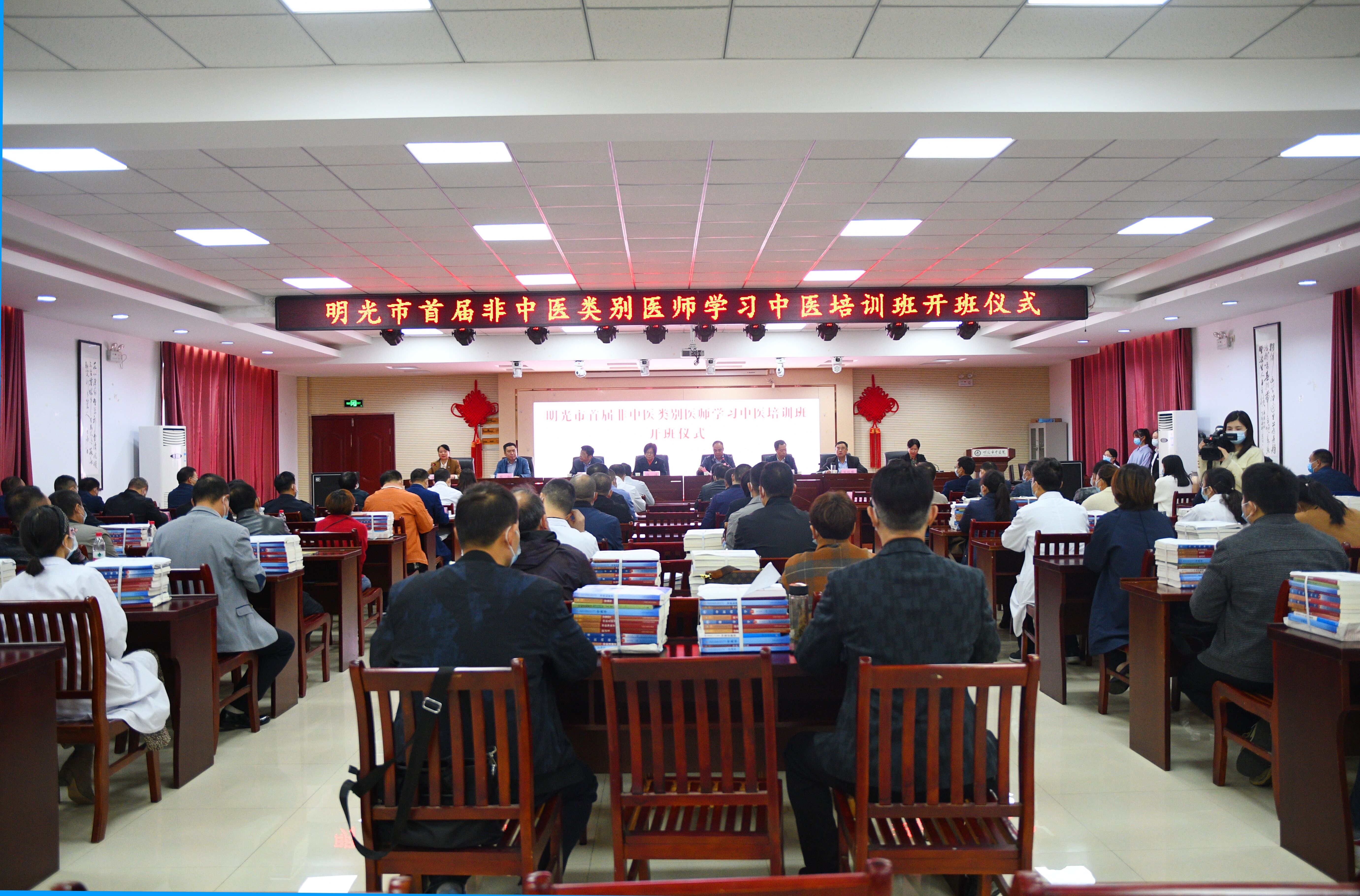 10月15日,明光市首届(滁州市第二期)“西学中”培训班在明光市中医院举行开班仪式。安徽省卫生健康委中医药发展处一级调研员张洁,滁州市卫生健康委副主任宋延举,明光市委常委、常务副市长刘静,我校发展规划处处长申国明、继续教育学院院长方正清、中西医结合学院院长蔡标,明光市卫生健康委党组书记、主任谢芳,明光市中医院党委书记杨萍出席开班仪式。来自明光市各级各类医疗卫生机构的71名西医师,滁州市卫生健康委、明光市卫生健康委、明光市中医院、学校继续教育学院、中西医结合学院相关人员参加了开班仪式。谢芳主持开班仪式。