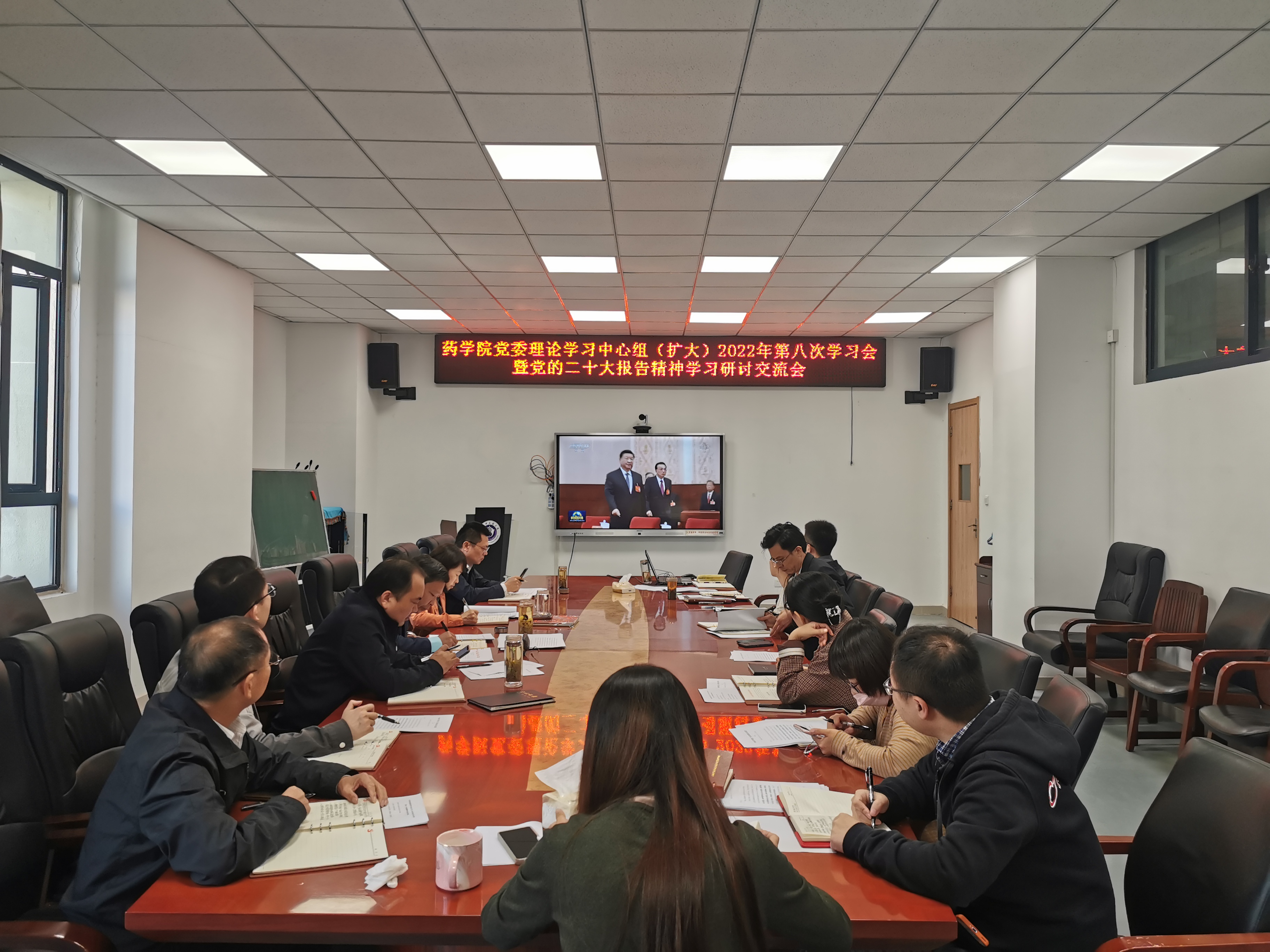 10月19日上午,药学院党委在313会议室召开2022年第八次中心组(扩大)理论学习会暨党的二十大精神学习研讨交流会,药学院班子成员、党委委员、党支部书记参加学习会,会议由药学院党委书记胡卿主持。