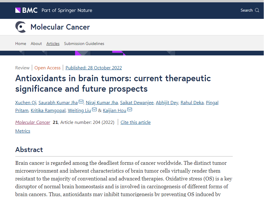 2022年10月,安徽中医药大学护理学院的侯凯健和刘维婷老师以通讯及共同通讯作者在国际顶级期刊Molecular Cancer(JCR Q1,IF 41.144)出版题目为Antioxidants in Brain Tumors: Current Therapeutic Significance and Future Prospects的综述学术论文,据悉该文章是该老师与印度沙尔达大学工程技术学院的Saurabh Kumar Jha教授团队及绍兴市人民医院的亓旭晨院长通力合作下共同完成的。