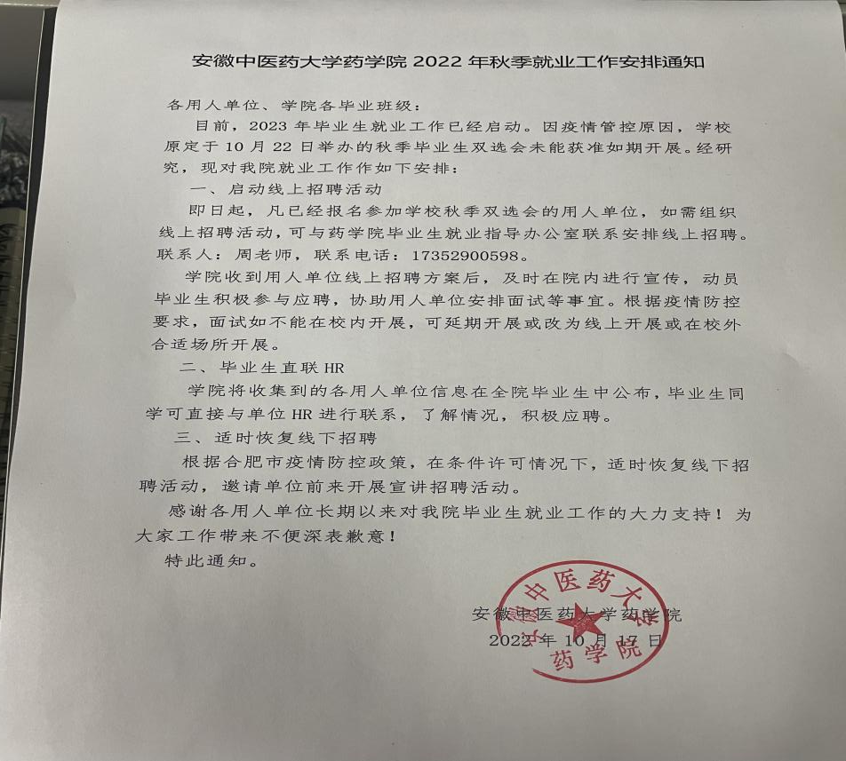 强化担当,加强对就业工作的组织领导。药学院面向用人单位及时发布了《安徽中医药大学药学院2022年秋季就业工作安排通知》,建立长效联系机制,为用人单位招聘做好服务工作,最大限度降低疫情对毕业生就业工作的影响。