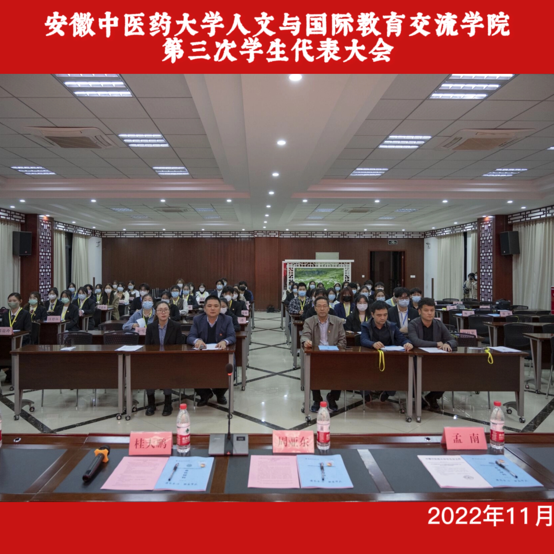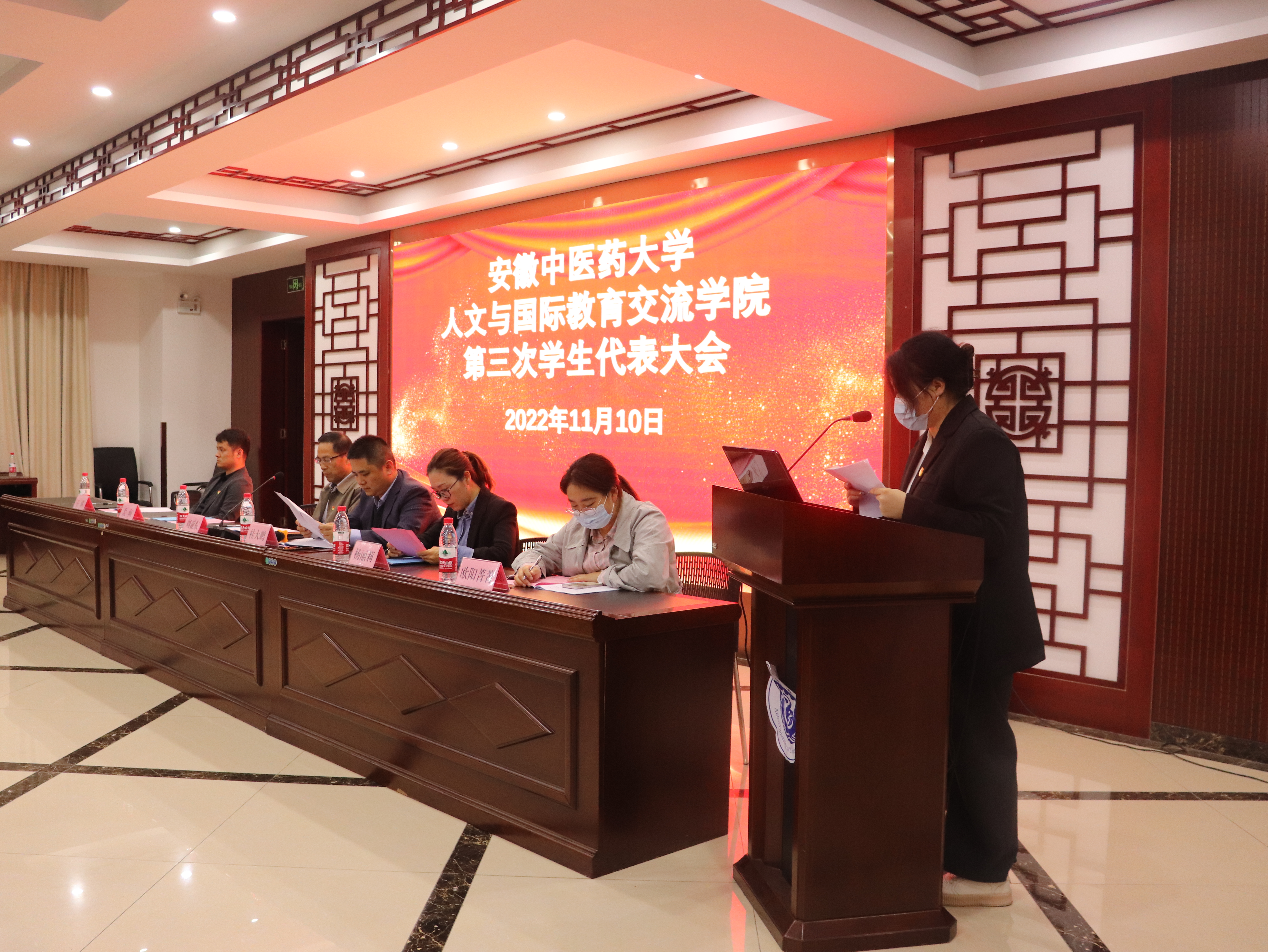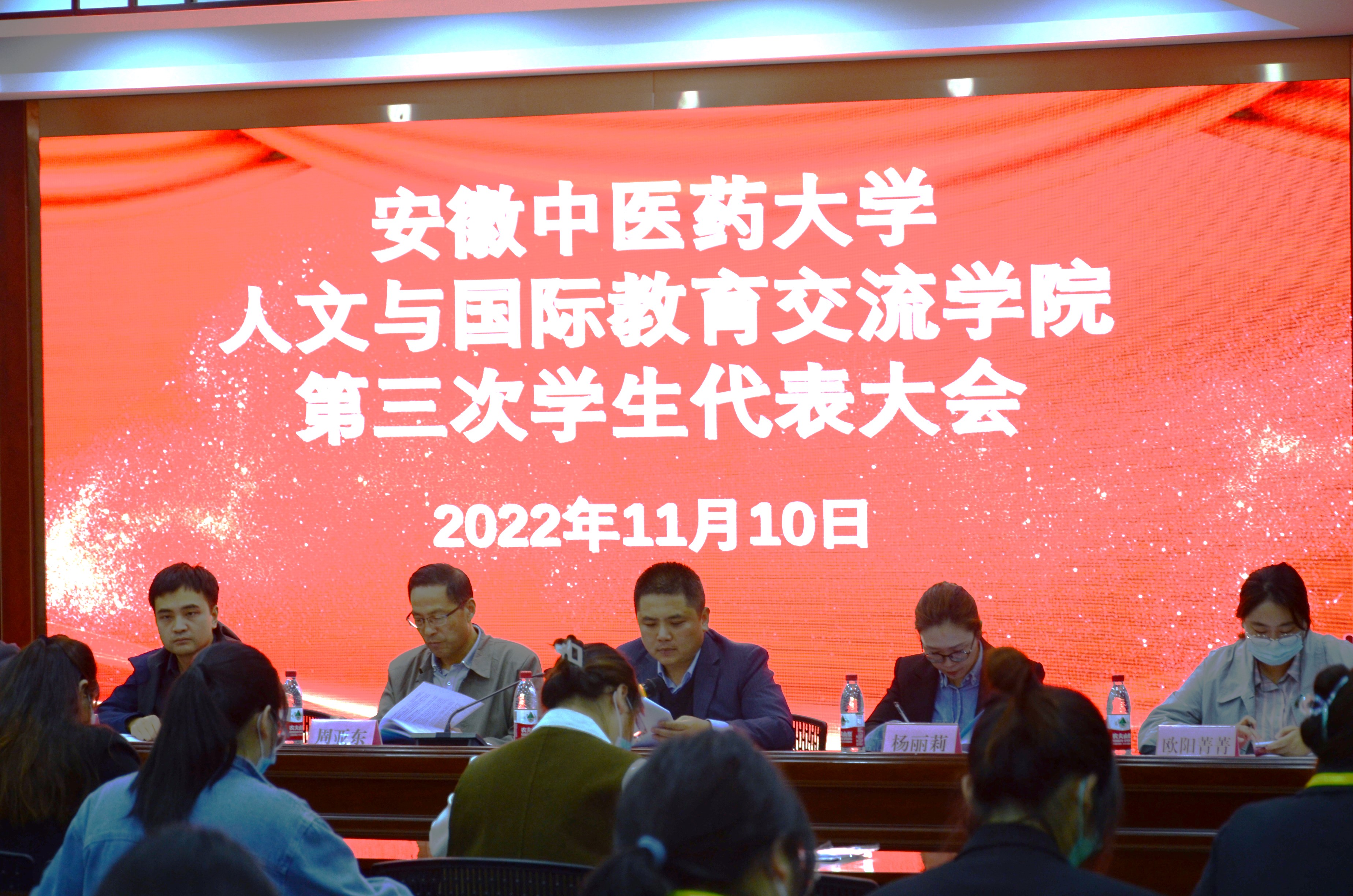 11月10日,安徽中医药大学人文与国际教育交流学院第三次学生代表大会在惟新楼380沁馨堂顺利召开。学院党总支副书记、院长周亚东,副书记桂大鹏,校团委社团管理科孟南,学院工会主席,学院团委书记,全体辅导员和全体学生代表参加大会,会议由学院党总支副书记桂大鹏主持。