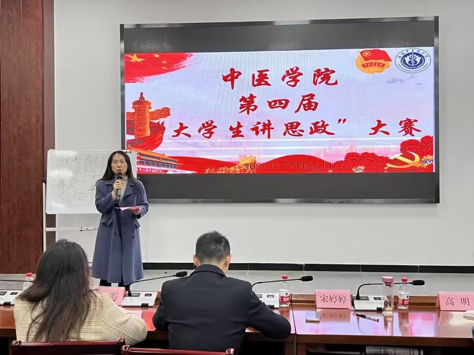 为进一步贯彻落实党的二十大精神,深入推进我校思政课实践教学改革和思政课程建设,引导大学生弘扬友善精神,提升综合素质,中医学院于11月15日在中医学院宅仁堂举办中医学院第四届“大学生讲思政”大赛。安徽中医药大学中医学院党委副书记宋婷婷,安徽中医药大学校团委挂职副书记、马克思主义学院思政课教师聂多伟,中医学院教师张盛、辅导员高明、吴暇老师以及中医临床基础系研究生王斐然担任本次大赛评委。