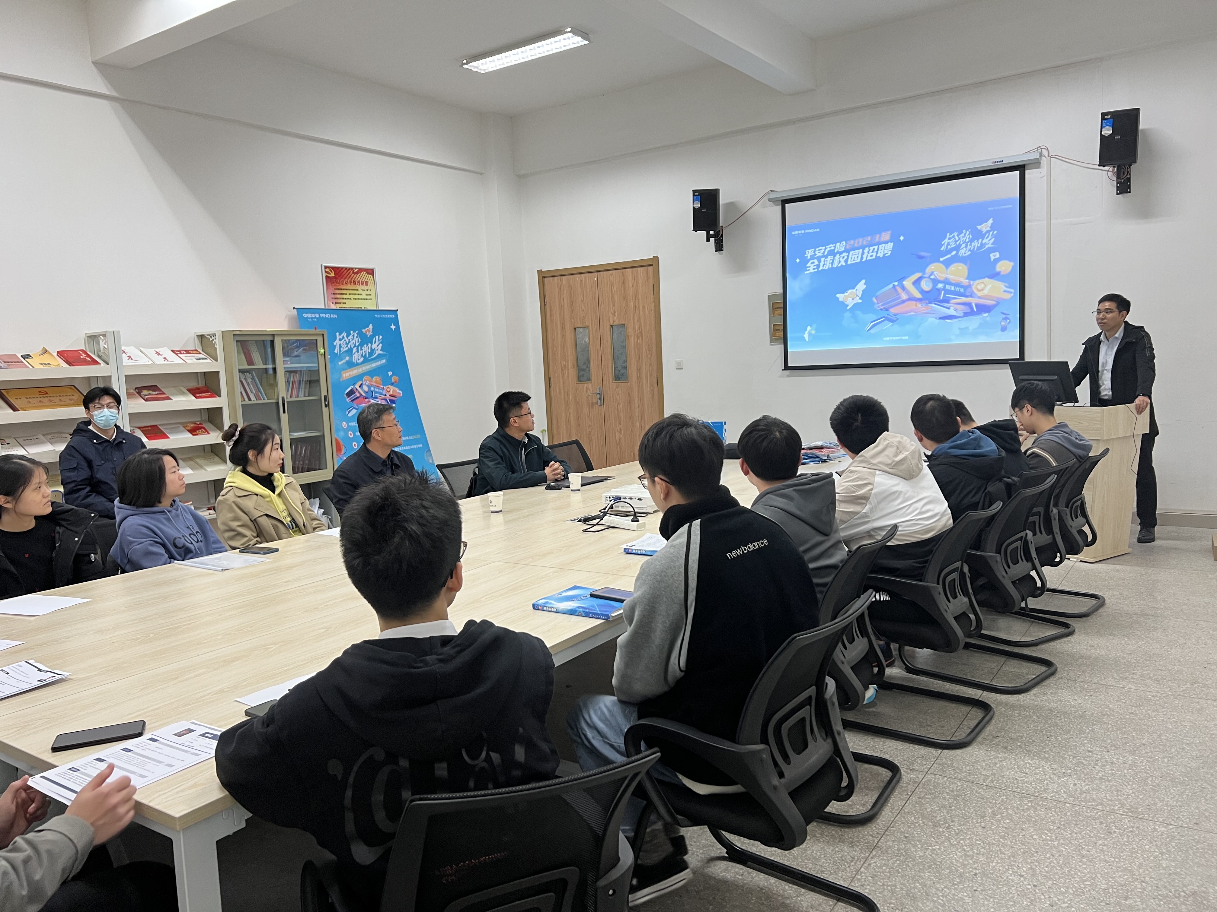 11月16日下午,医药经济管理学院举办平安产险安徽分公司专场招聘会,学院党委书记冯鑫、平安产险安徽分公司理赔管理部经理吴刚、非车险团队经理徐晓峰、优秀毕业生代表张会强及2023届毕业班学生参加此次招聘会。