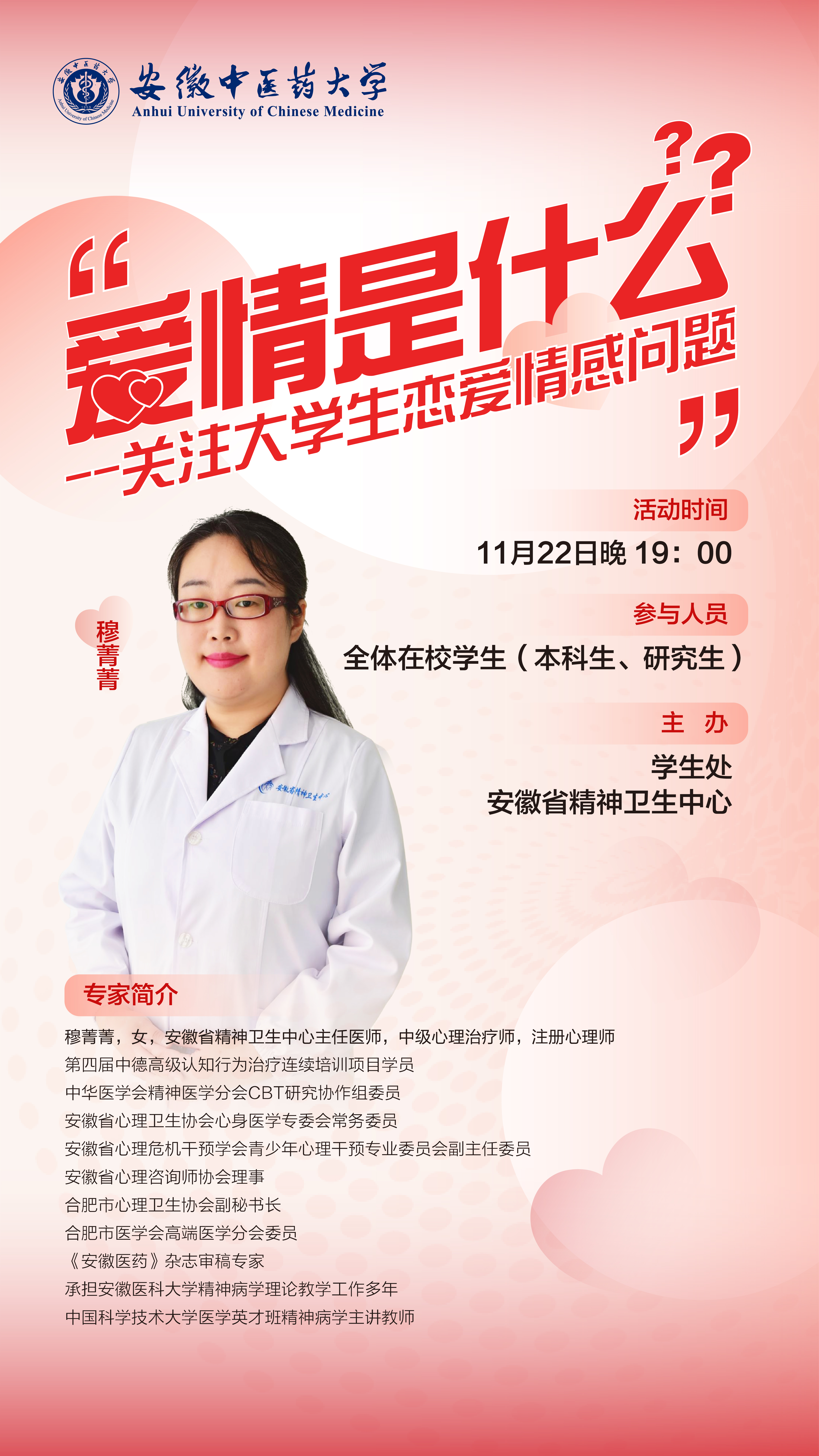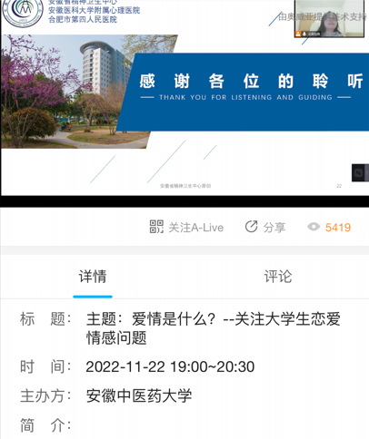 为深入推进“三全育人”综合试点工作,推动学校与安徽省精神卫生中心心理健康教育校医合作,引导学生树立正确的恋爱观,11月22日晚,学生处联合安徽省精神卫生中心在智慧树线上平台举办大学生心理健康月“爱情是什么?——关注大学生恋爱情感问题”专题讲座,安徽省精神卫生中心主任医师穆菁菁应邀与同学们在线交流,超过6000人在线观看,获点赞1.6万。
