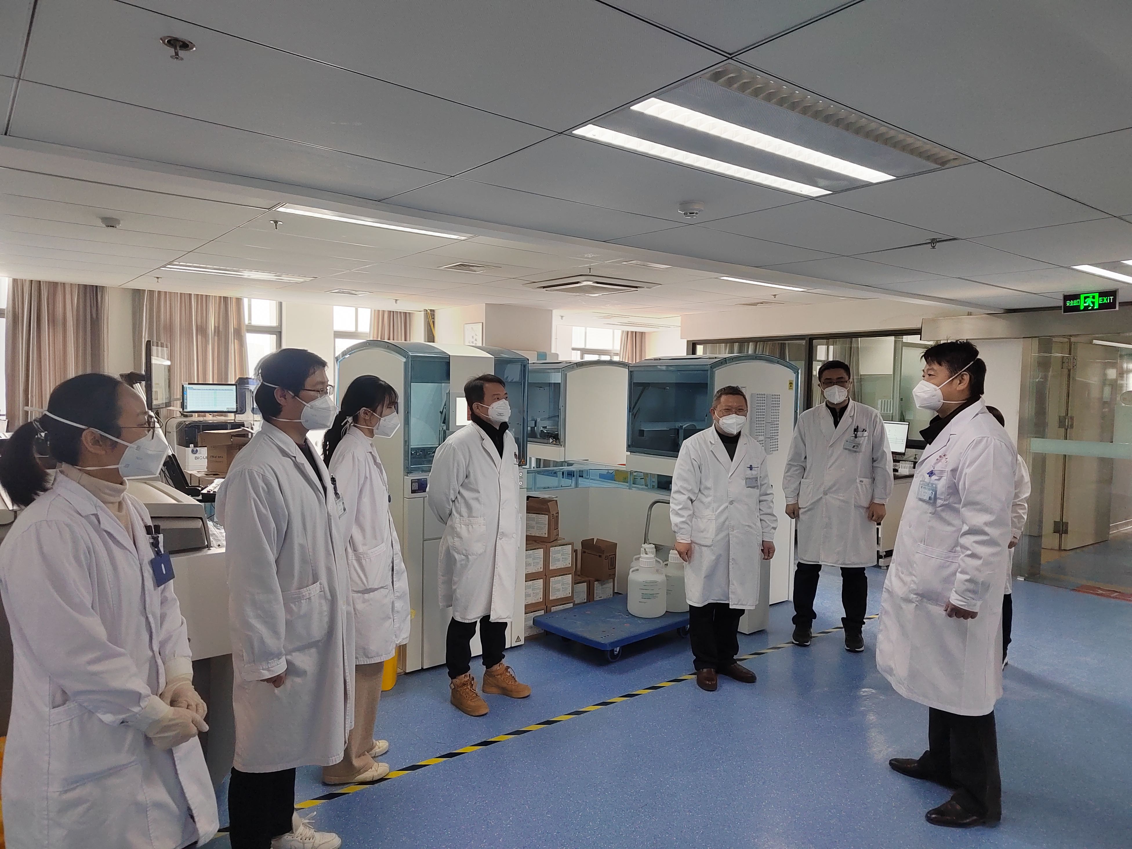 聂久胜在检验中心,详细询问了检验中心工作开展情况。聂久胜向新冠阳性康复后的立即上岗的同志表示了慰问,对克服困难坚守岗位的同志们表示了肯定。他表示,疫情防控进入新阶段,面临新形势、新任务,大家必须践行医务工作者的初心与使命,众志成城、共克时艰,科室负责人、党员必须冲锋在第一线、战斗在最前沿。强调大家在坚守工作岗位、严格落实防控措施的同时,一定要做好个人防护,医院党委将始终与大家奋战在一起,全力做好疫情防控和服务保障工作,奋力夺取疫情防控的最终胜利。