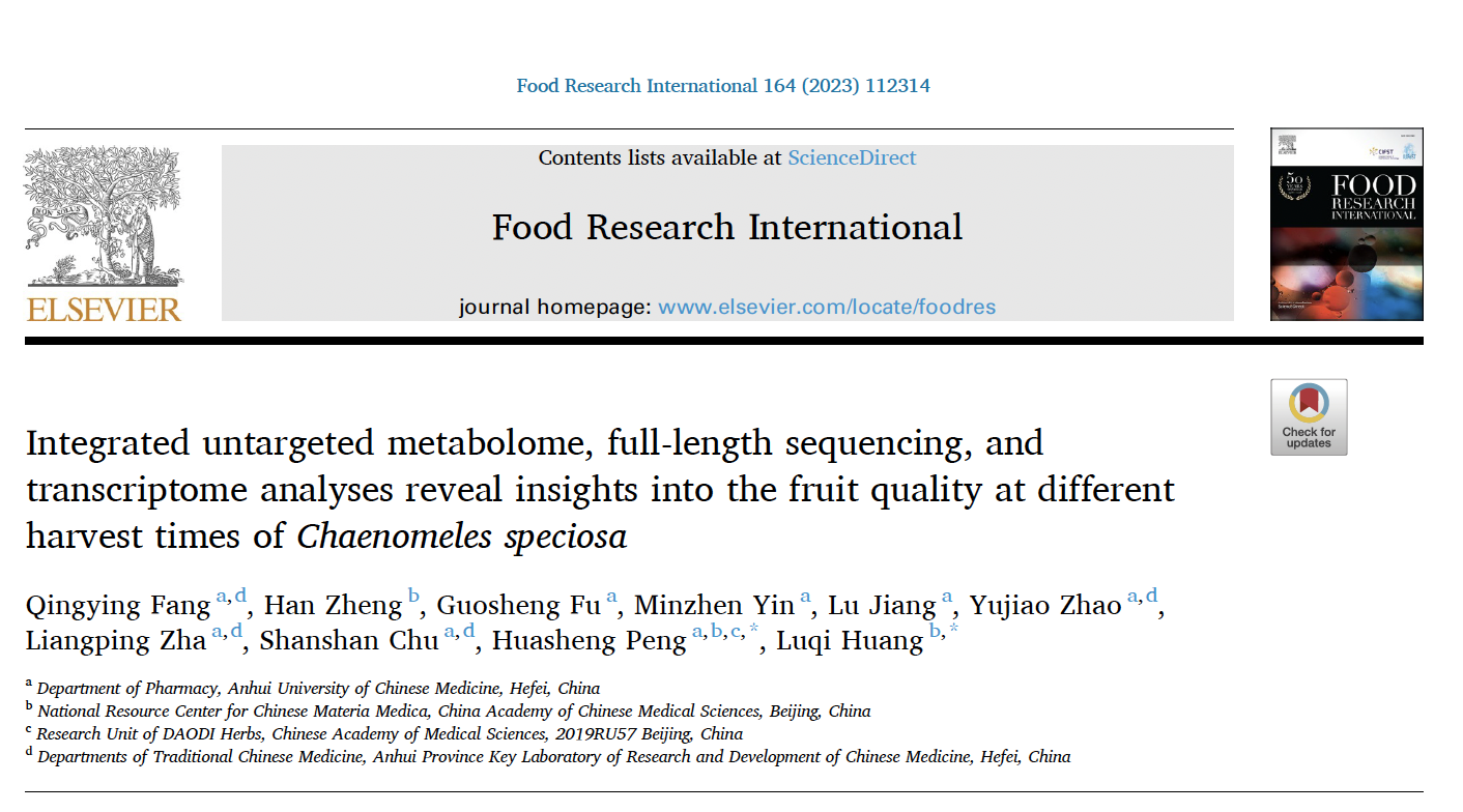 近日,药学院青年教师方清影在Food Research International(中科院一区TOP期刊,影响因子7.425)发表题为Integrated untargeted metabolome, full-length sequencing, and transcriptome analyses reveal insights into the fruit quality at different harvest times ofChaenomeles speciosa的研究论文。中国工程院院士、安徽中医药大学博士生导师黄璐琦研究员和中药资源系主任彭华胜教授是该文的通讯作者。安徽中医药大学为第一完成单位。