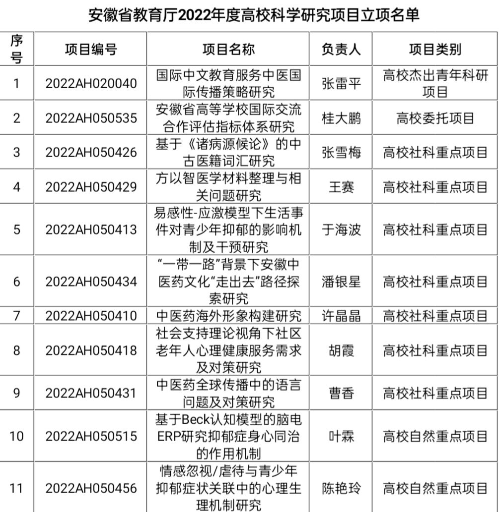 近日,安徽省教育厅公布2022年度高校科学研究项目立项名单,学院共11个项目获省教育厅立项资助,其中高校杰出青年科研项目1项,高校委托项目1项,高校社科重点项目7项,高校自然重点项目2项。
