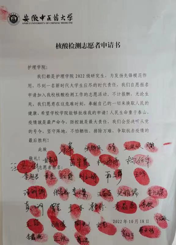 国庆节过后,疫情形势严峻,学校进行了封闭管理。由于合肥疫情突然多点发生,社区医护人员力量严重紧缺,无暇顾及新校区师生的核酸检测。紧急关头,学校在护理学院发布了核酸检测志愿者招募信息。“疫情就是命令,防控就是责任。”“我报名”“我参加”……群里接龙信息一个接一个,不到1小时,39名拥有护士资格证的研究生,按下了核酸检测志愿者申请书的红手印,组成了“践行初心”青年突击队。其中女生36人,男生3人,拥有8年工作经验的主管护师渠苹同学、护师蔡玉杰同学,成为了团队骨干。