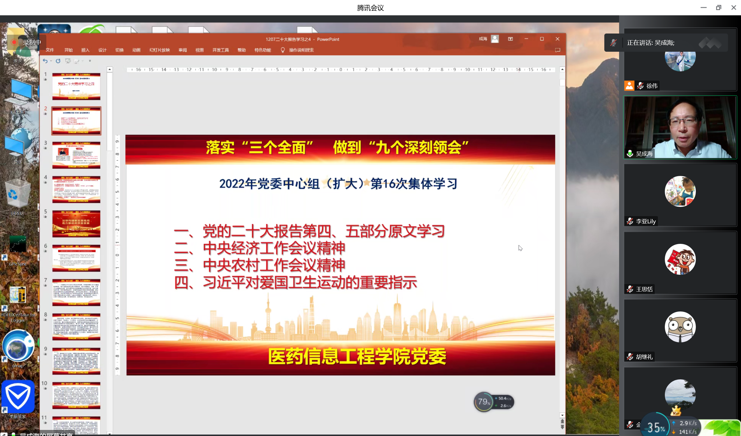 12月29日,医药信息工程学院通过线上形式召开党委中心组(扩大)学习会,学院党委委员、各党支部书记参加会议,会议由学院党委书记吴成海主持。