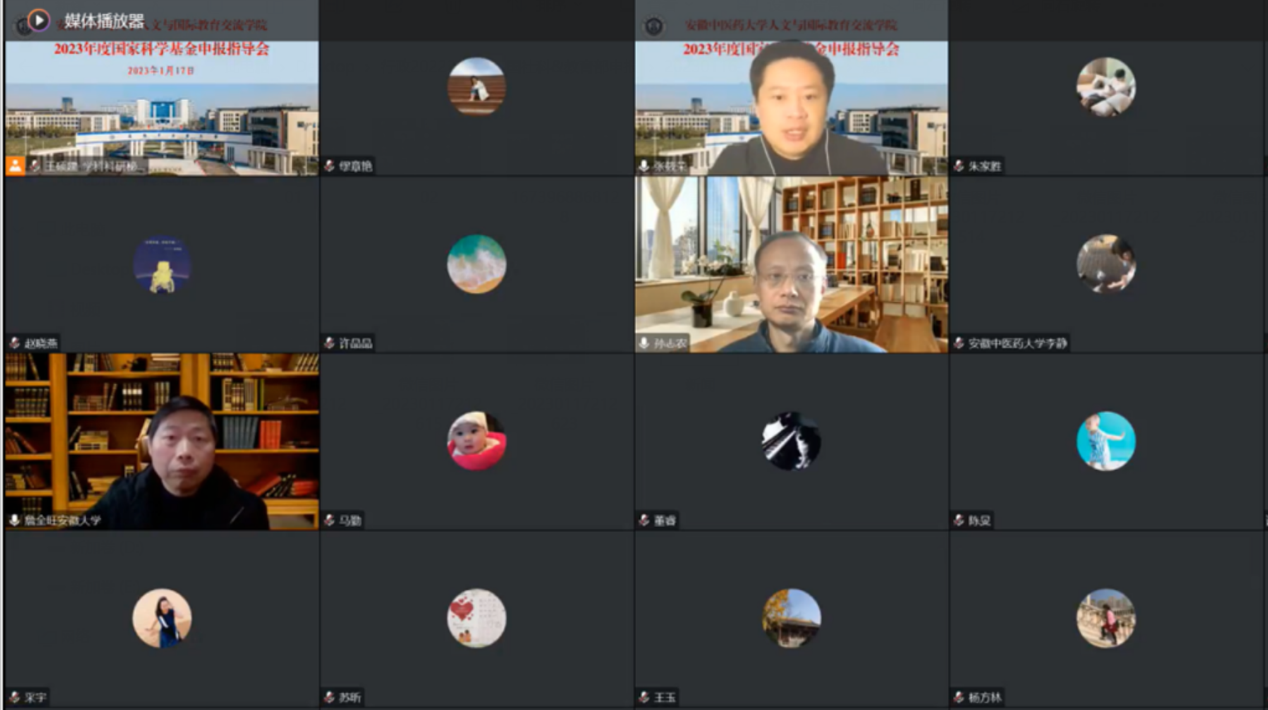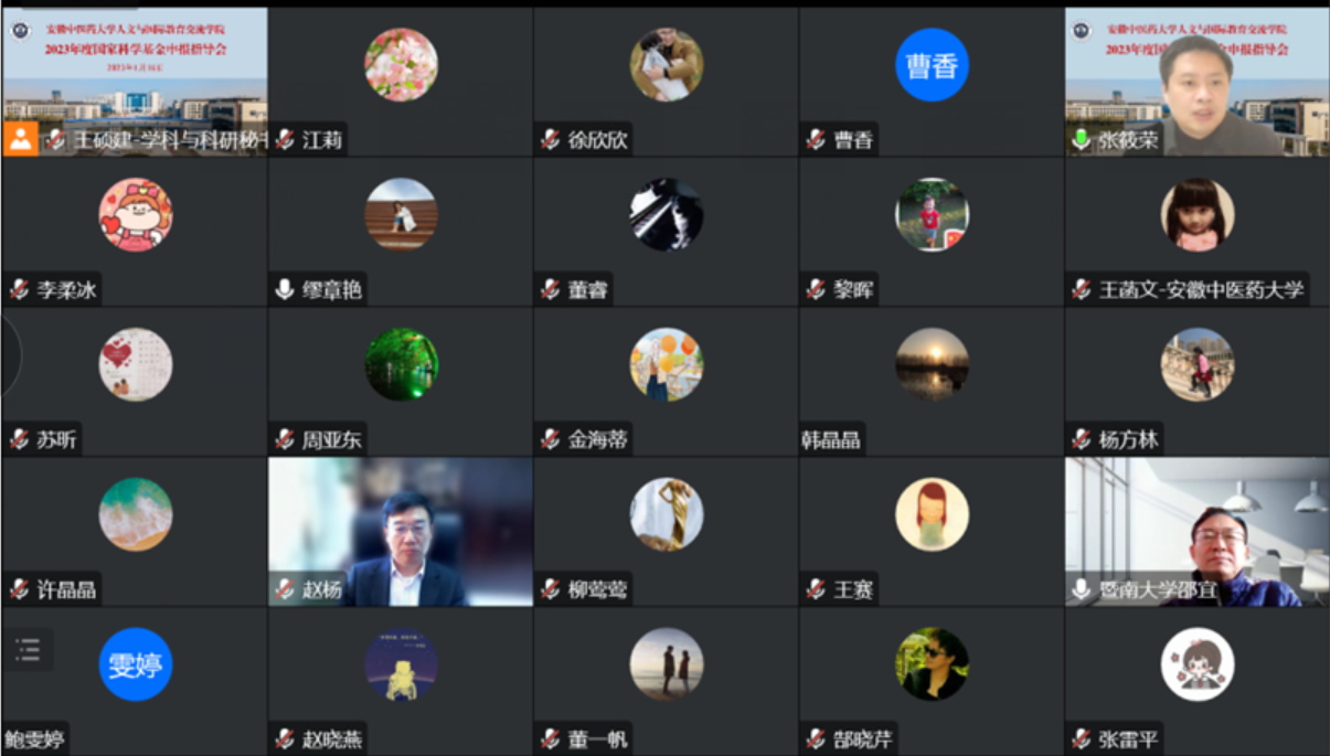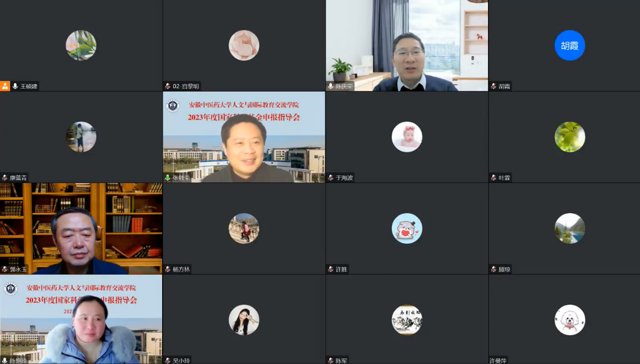 为扎实推进学院国家科学基金申报工作,进一步提升项目申报质量,1月16日至17日,人文与国际教育交流学院举行2023年度国家科学基金申报系列线上专家指导会。北京大学对外汉语教育学院院长赵杨教授,暨南大学华文学院院长邵宜教授,南京师范大学心理学院院长陈庆荣教授,南京师范大学人格与社会心理研究所所长郭永玉教授,安徽大学外语学院院长詹全旺教授,安徽农业大学国家一流专业(英语专业)建设点负责人孙志农教授,人文与国际教育交流学院院长周亚东出席会议。学科科研办秘书及学院教师参加会议。