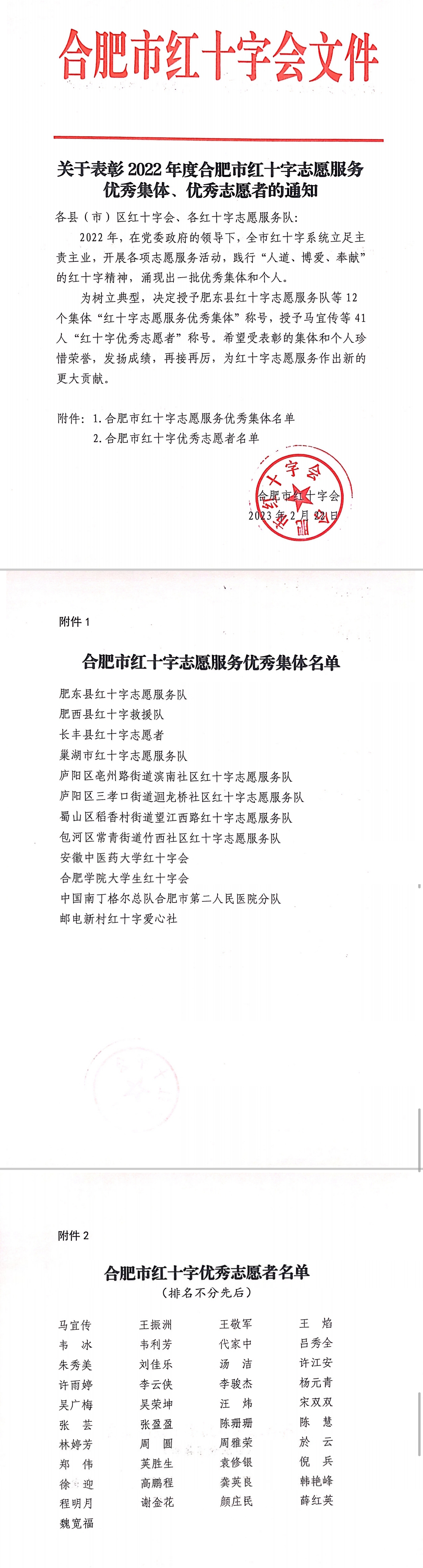 为树立典型,继续践行“人道、博爱、奉献”的红十字精神,合肥市红十字会表彰了12个2022年度合肥市红十字志愿服务优秀集体、41名红十字优秀志愿者,我校红十字会荣获表彰,韦冰、陈慧两名同学获评红十字优秀志愿者。