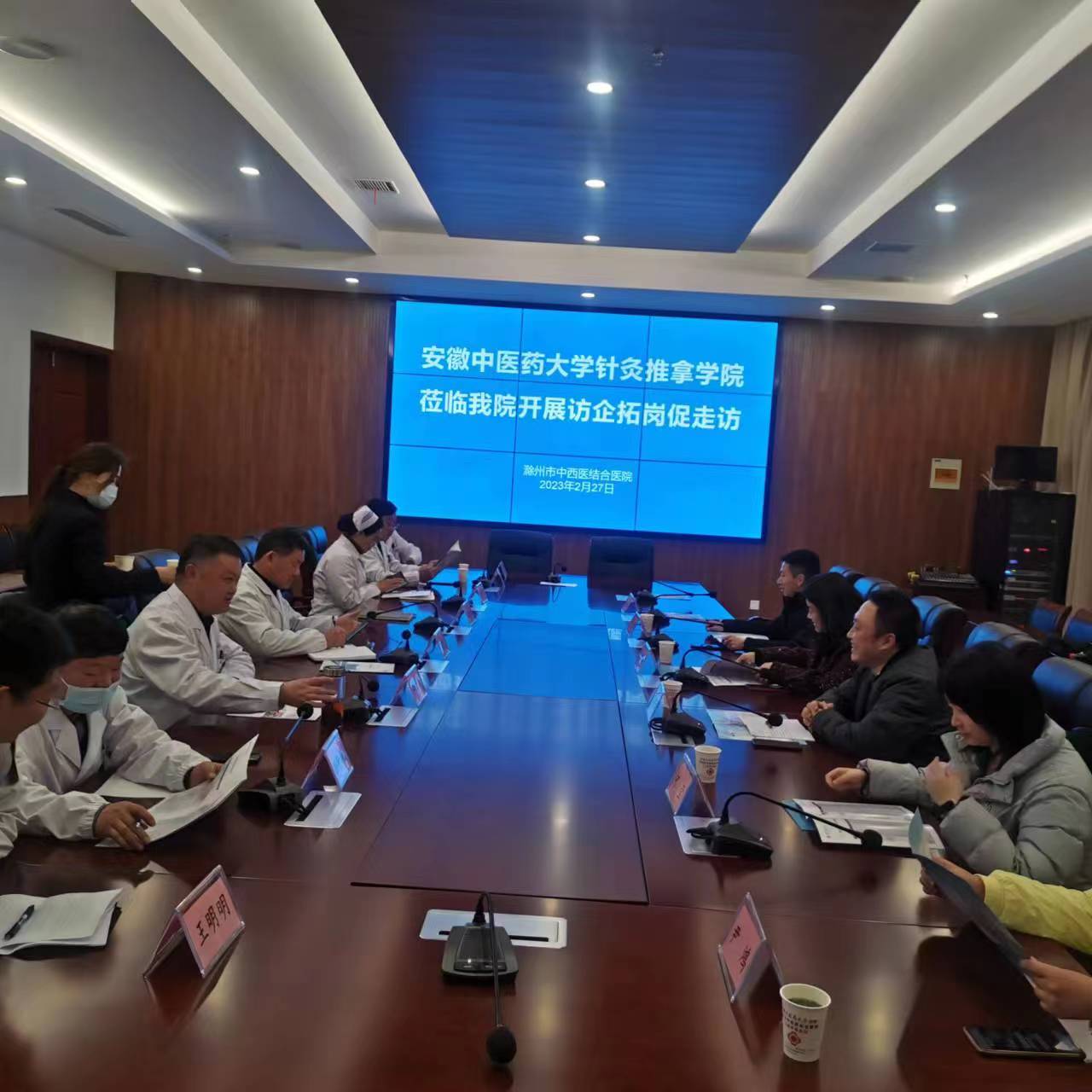 在滁州市中西医结合医院,医院党委书记龚建义、院长陈跃梅对针灸推拿学院领导一行到访表示欢迎,并分别就医院发展、科室分布、规培基地建设、人才培养、中医药专业人才需求等情况进行了介绍。