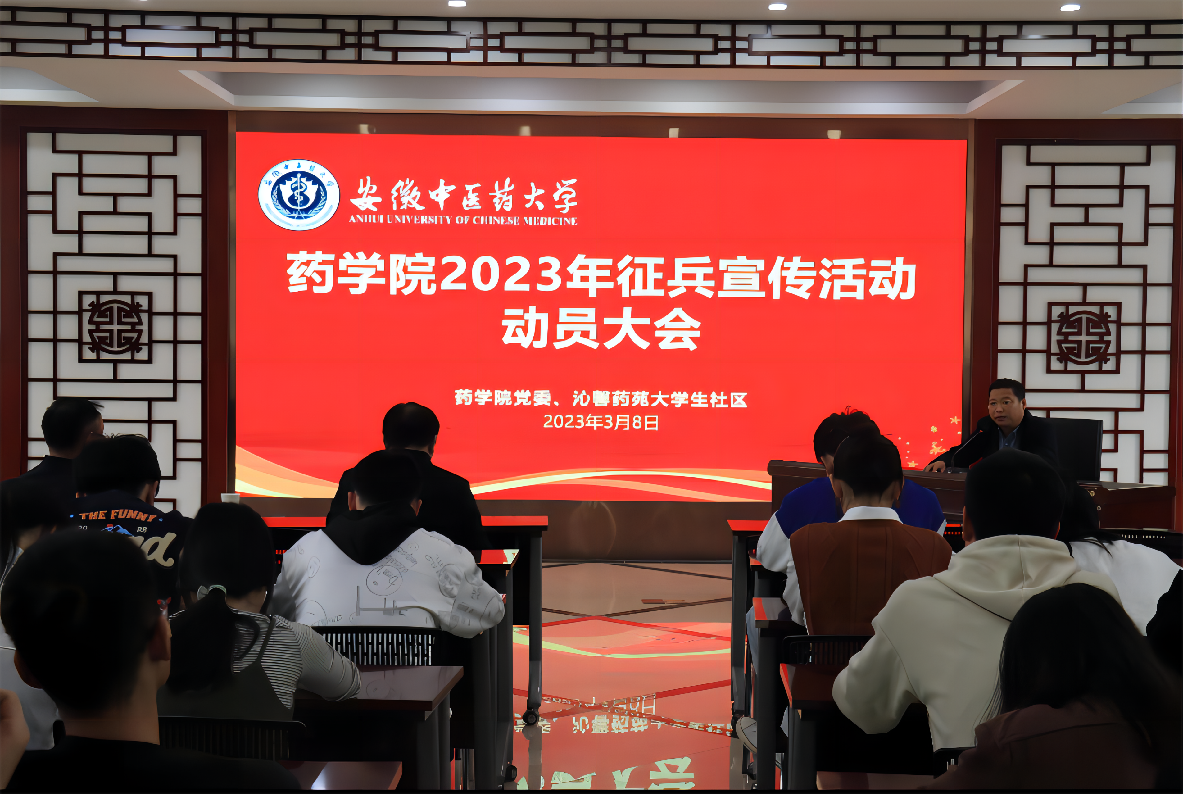 詹钟华介绍了学校近年来的征兵工作情况,传达了上级征兵工作相关文件精神,他指出参军是政治上有荣誉,经济上有收益,发展上有帮助,就业上有保障的新型职业路径,鼓励同学们心怀家国梦想,树立责任担当,勇挑重担,参军入伍。刘睿对2023年度大学生征兵政策进行宣讲,包括征兵相关条件、兵种介绍、参军报名流程以及安徽中医药大学本科生应征入伍优惠政策等。