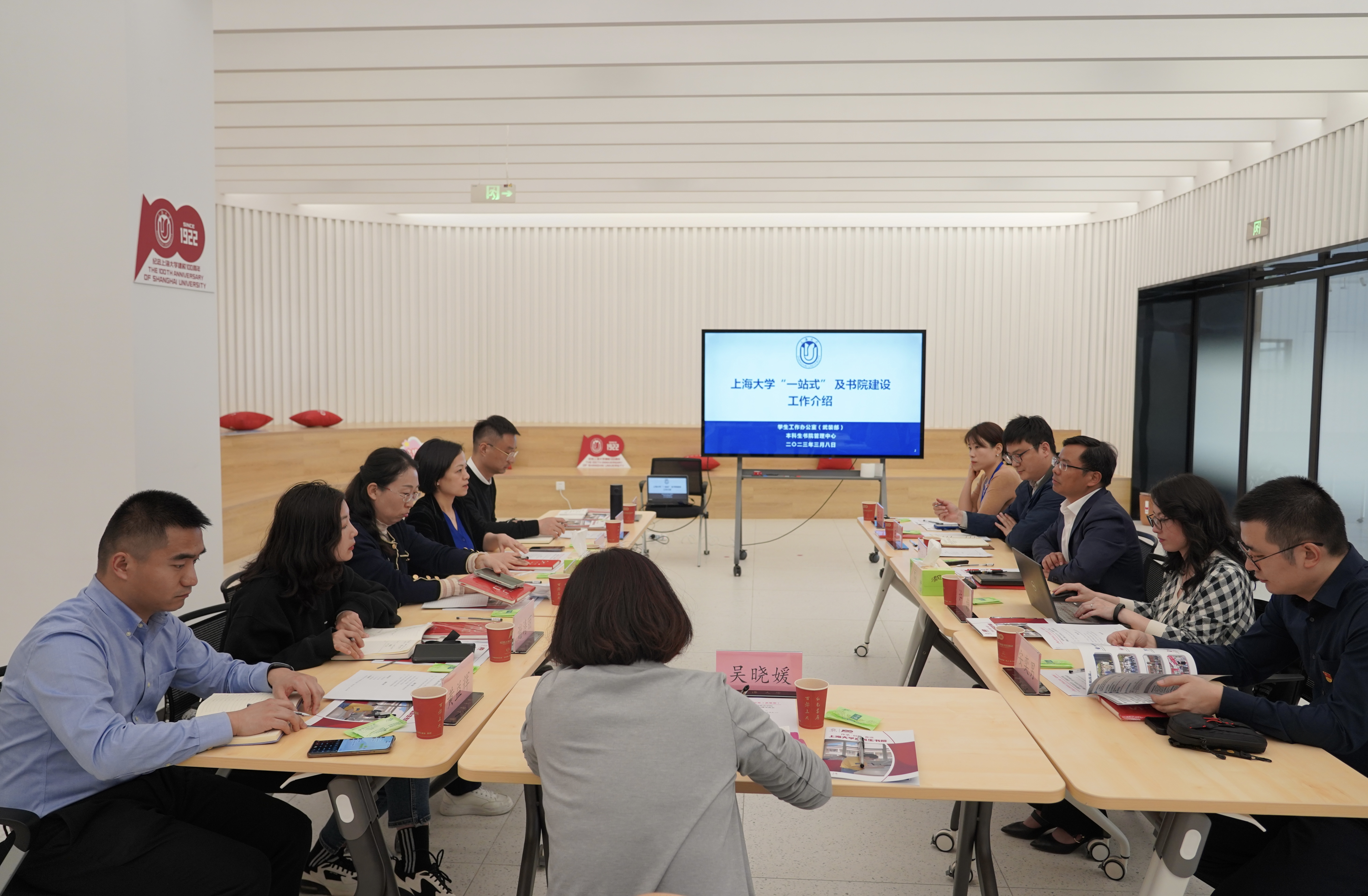 上海大学学生工作办公室主任、武装部部长、本科生书院管理中心主任孟祥栋等接待了我校调研团队。会上,孟祥栋就上海大学的基本情况以及上海大学“一站式”学生社区建设的背景、推进情况、特色成效、本科生书院的建设进展和模式内容以及学工部门运行机制等方面进行了介绍。会后,金晓琴一行实地参观了日新书院、伟长书院,了解“一站式”学生社区和书院制的建设成效。