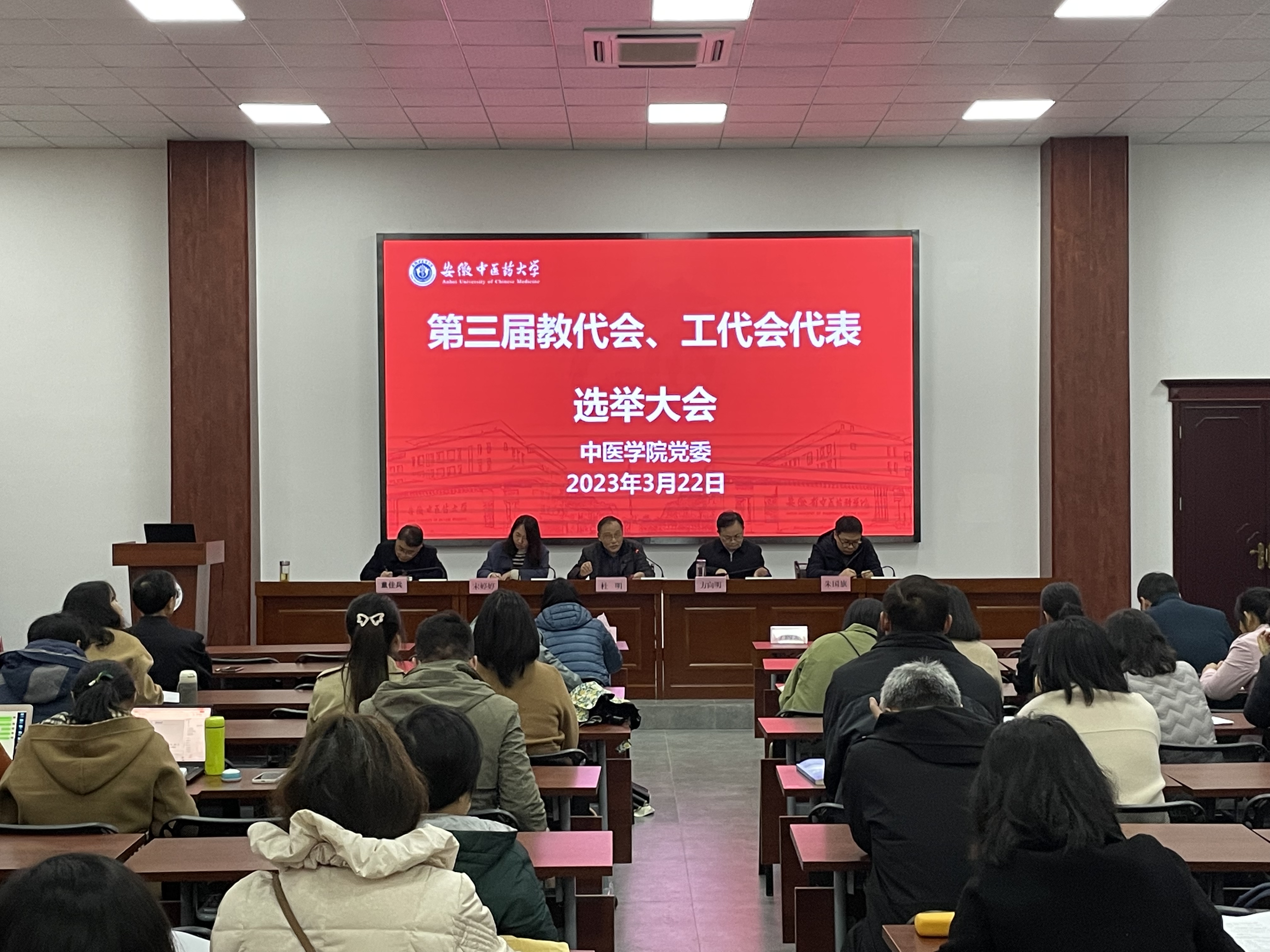 3月22日下午,中医学院党委在少荃湖校区宅仁堂报告厅召开学院第三届教代会、工代会代表换届选举大会,全体教职工参加会议,会议由学院党委书记杜明主持。