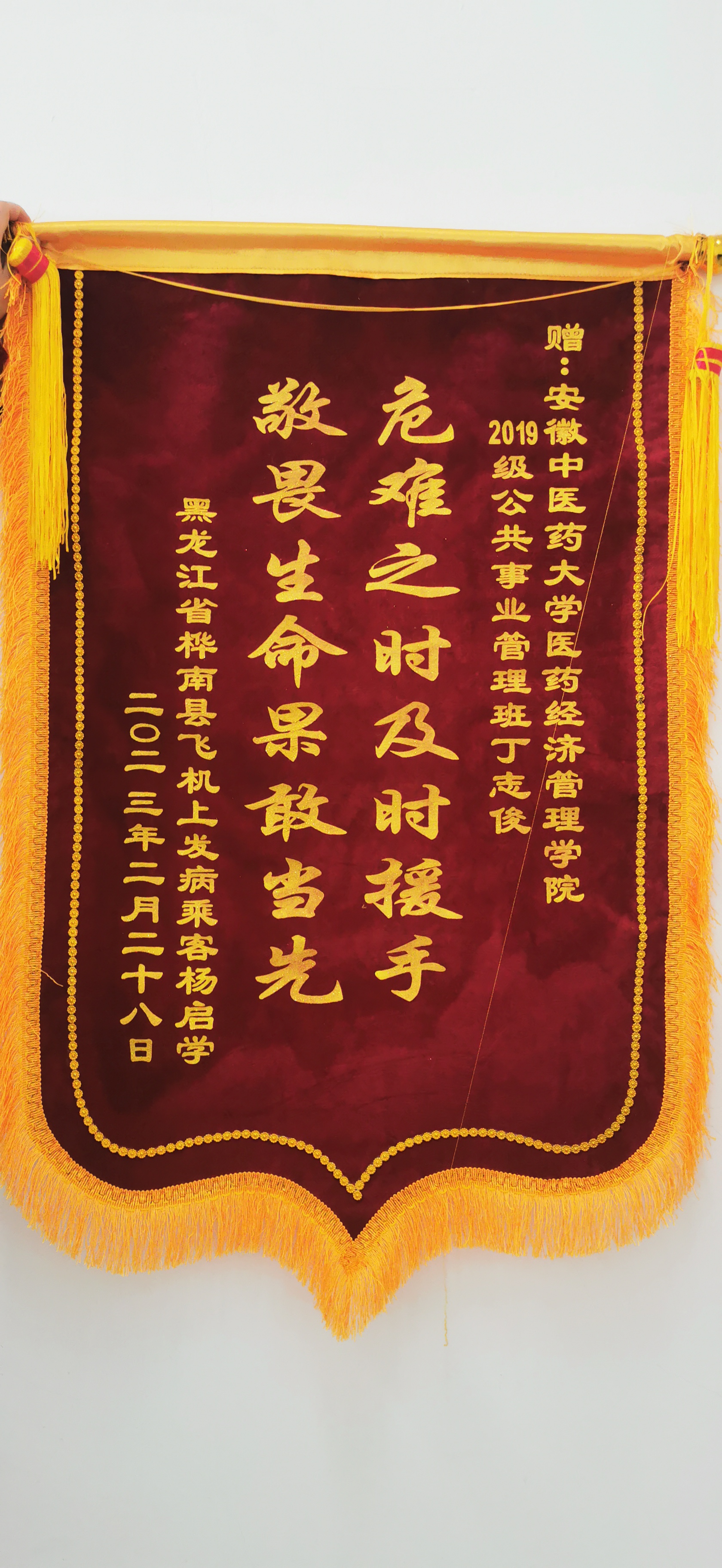 近日,医药经济管理学院收到一面锦旗,表达了对该院2019公管班丁志俊在万米高空,挺身而出救人的感激之情。