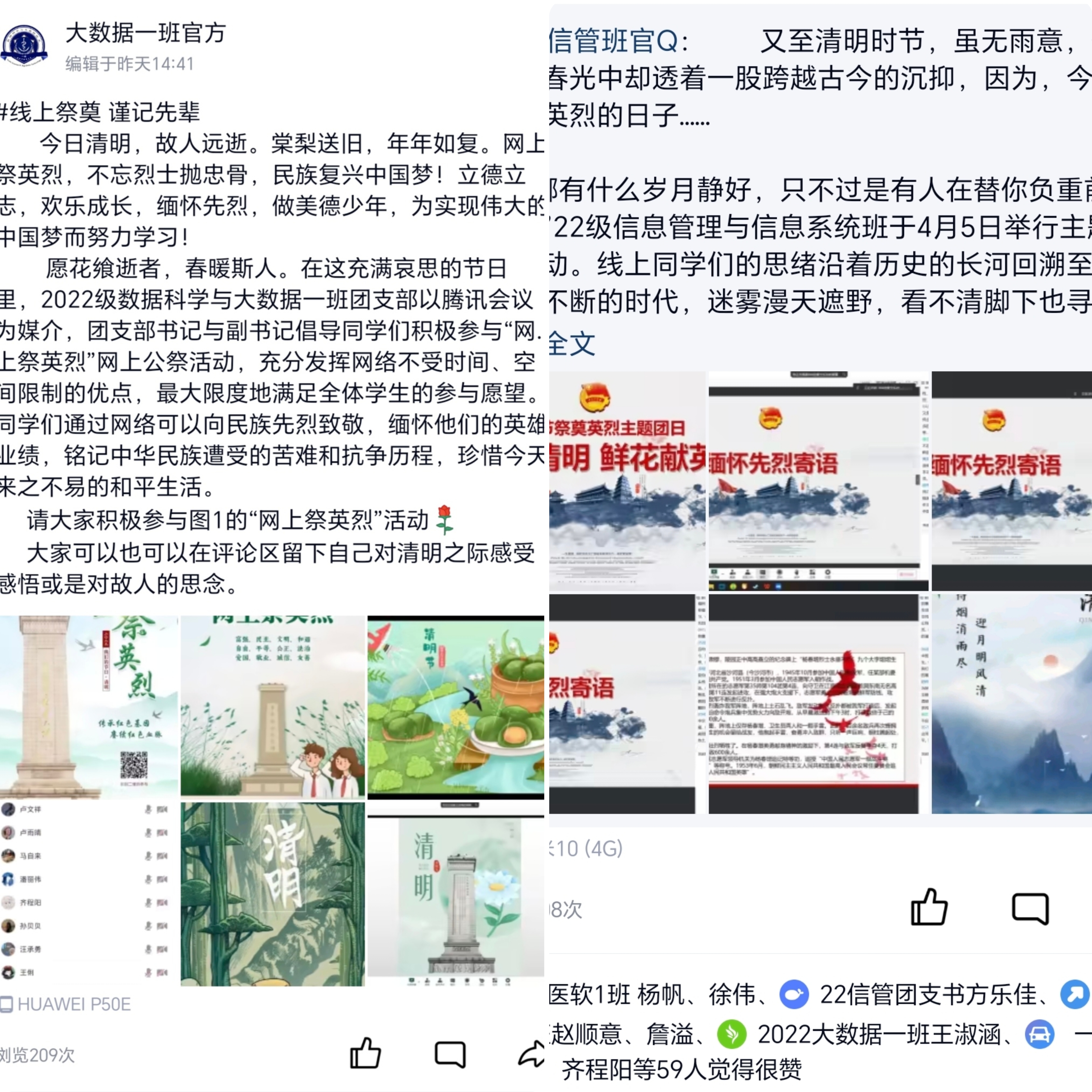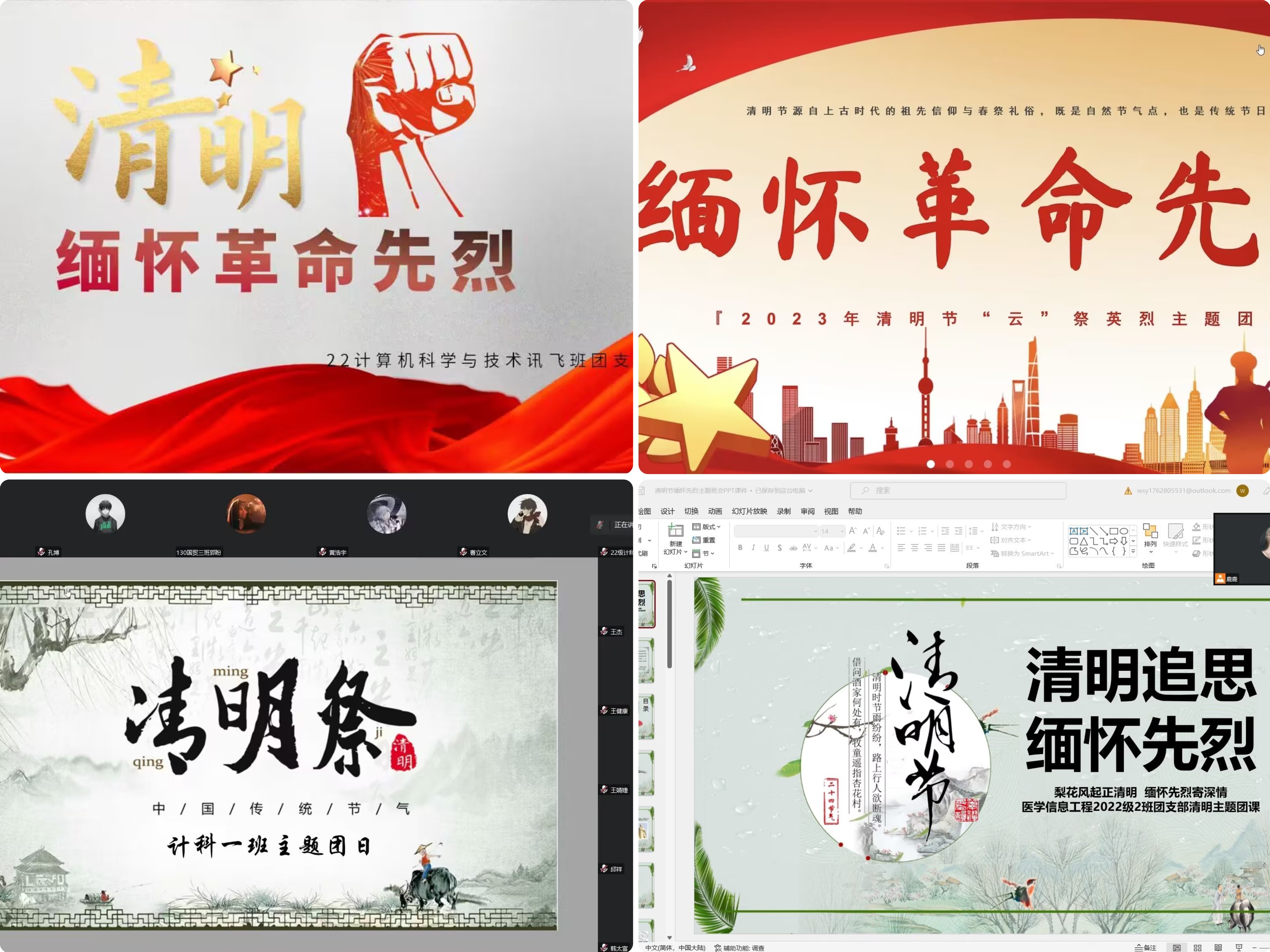 此外,其他各班团支部还组织开展了“清明节”主题团课、主题班会、线上祭扫等活动,同学们了解清明节的传统习俗,讲述革命烈士的英勇事迹,共唱红色歌曲。