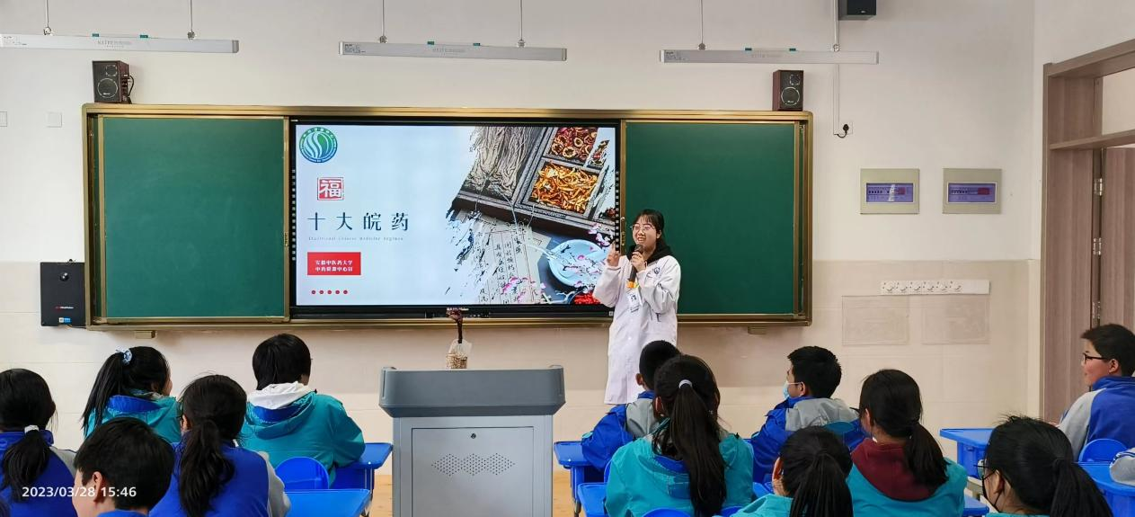 中医药文化走出去,科普实践进小学。“为什么说菊花入药的是花序呢,我们所看到的一个完整的“花”,其实是它的花序。……花序中心的每一朵小花都相应的连接一个花瓣。”药学院2021级中药学2班管明欣以PPT的形式,通过清晰的图片、生动的故事,向合肥市第四十六中(黄河路校区)的同学们讲解“十大皖药”。