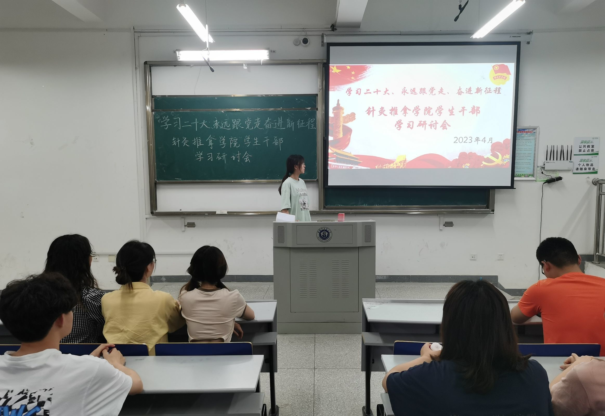 为学习贯彻党的二十大精神,引领青年成长成才,引导学生干部学习贯彻习近平总书记重要讲话精神,针灸推拿学院学生会于4月20日在公共教学楼A201开展以“学习二十大、永远跟党走、奋进新征程”为主题的学生干部学习研讨会。