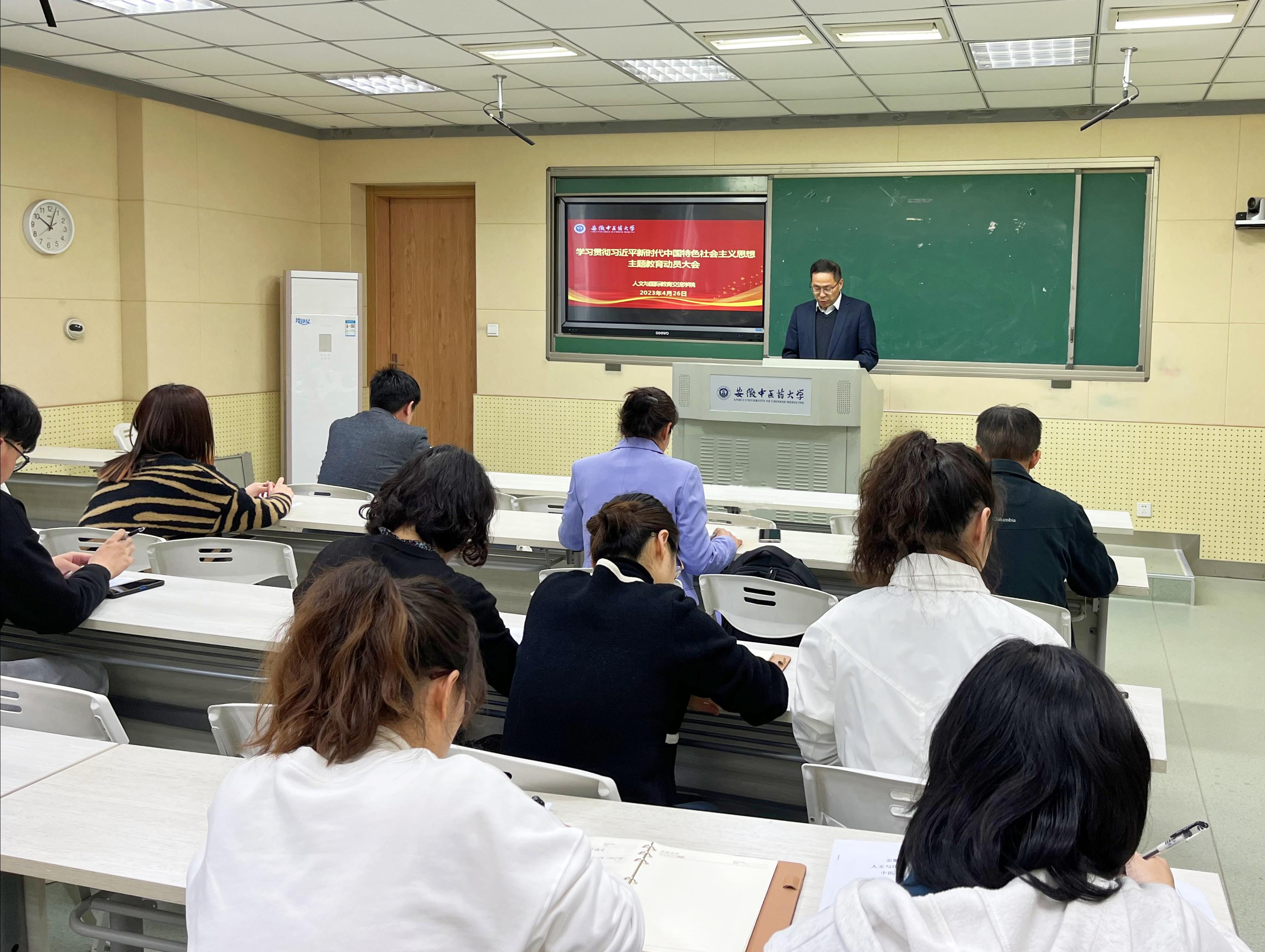 4月26日下午,人文与国际教育交流学院党总支在惟新楼376室召开学习贯彻习近平新时代中国特色社会主义思想主题教育动员部署会,全体教师党员、学生党员和各班级主要学生干部参加了会议,会议由学院党总支副书记、院长周亚东主持。