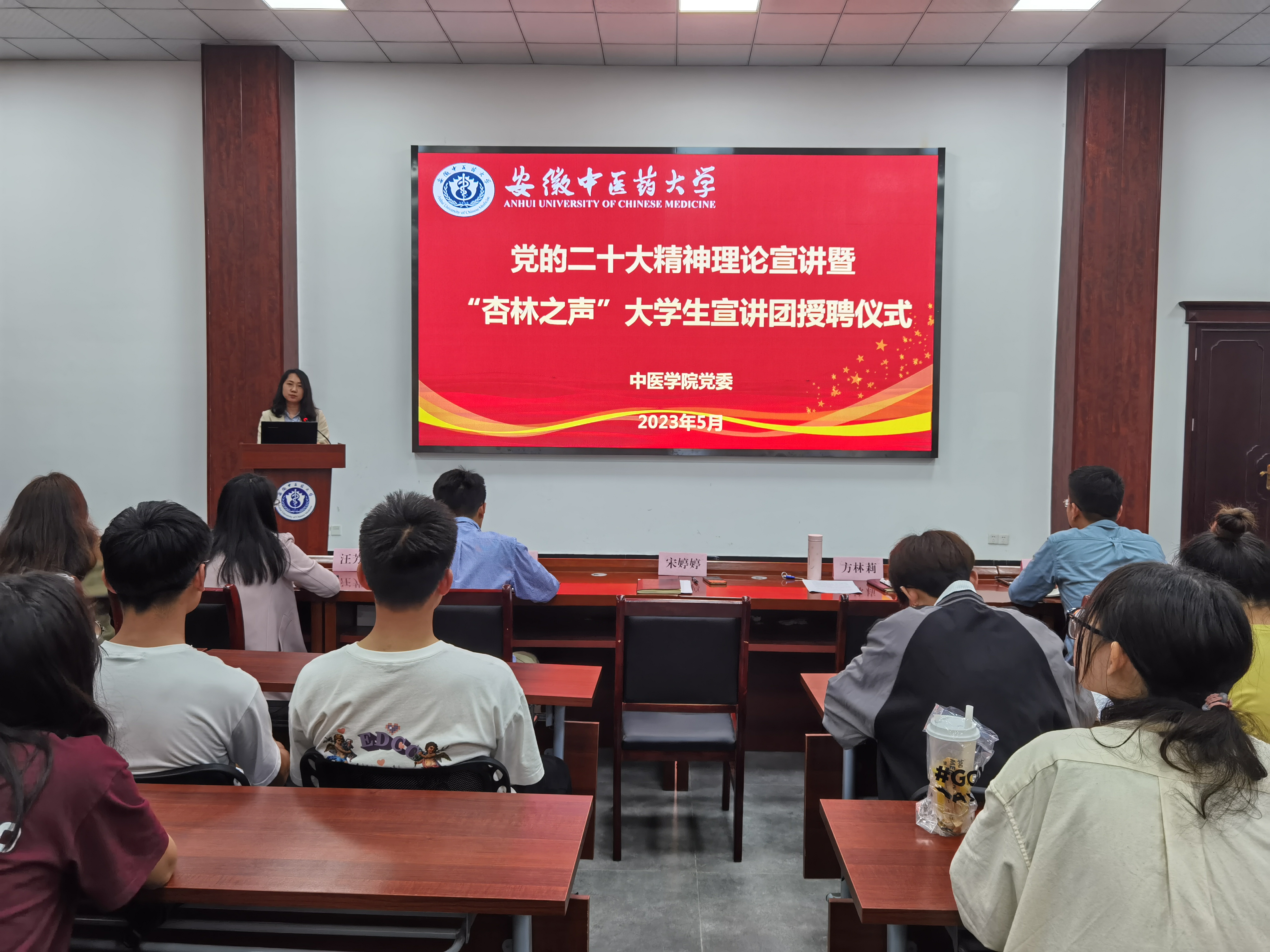 学习宣传和全面贯彻落实党的二十大精神和党中央决策部署,是当前和今后一个时期全党全国的首要政治任务。为深入学习宣传贯彻党的二十大精神,引导青年大学生坚定不移听党话、跟党走,立志做有理想、敢担当、能吃苦、肯奋斗的新时代好青年,5月4日,中医学院举办党的二十大精神理论宣讲暨“杏林之声”大学生宣讲团授聘仪式。学院党委副书记宋婷婷、全体辅导员及学生代表参会。