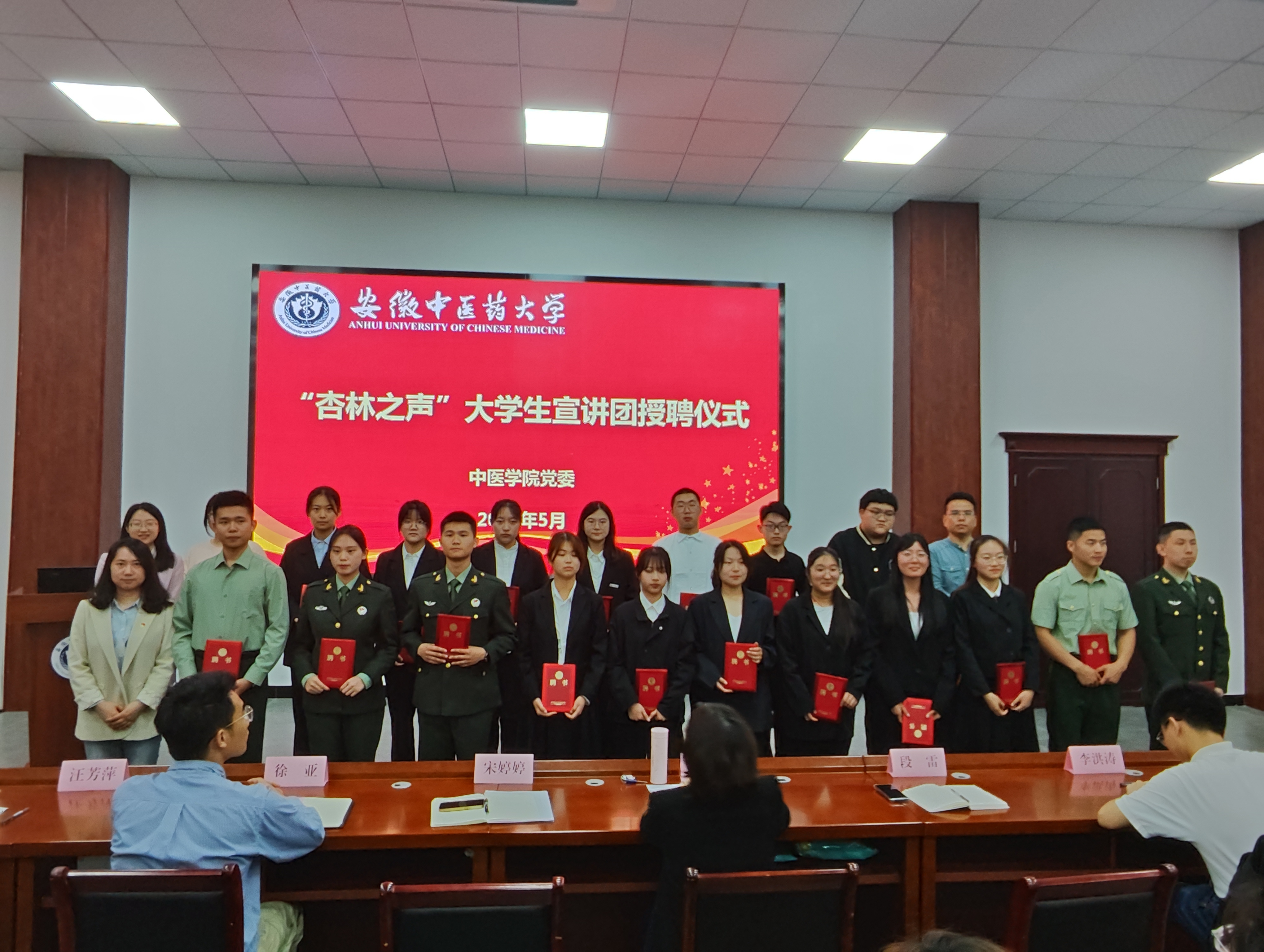 为了让广大青年学生讲好中国故事、中医故事、青春故事,坚定文化自信,贡献青春力量,中医学院成立了“杏林之声”大学生宣讲团并为成员颁发了聘书。宣讲团成员将走进班级、走进宿舍、走进学生,发挥辐射作用,积极开展宣讲,在大学生思想政治教育、党团组织建设、社会服务开展和文化传承创新等方面发挥重要作用。(方林莉/文 刘莹莹、徐子岳/图 杜明/审核)