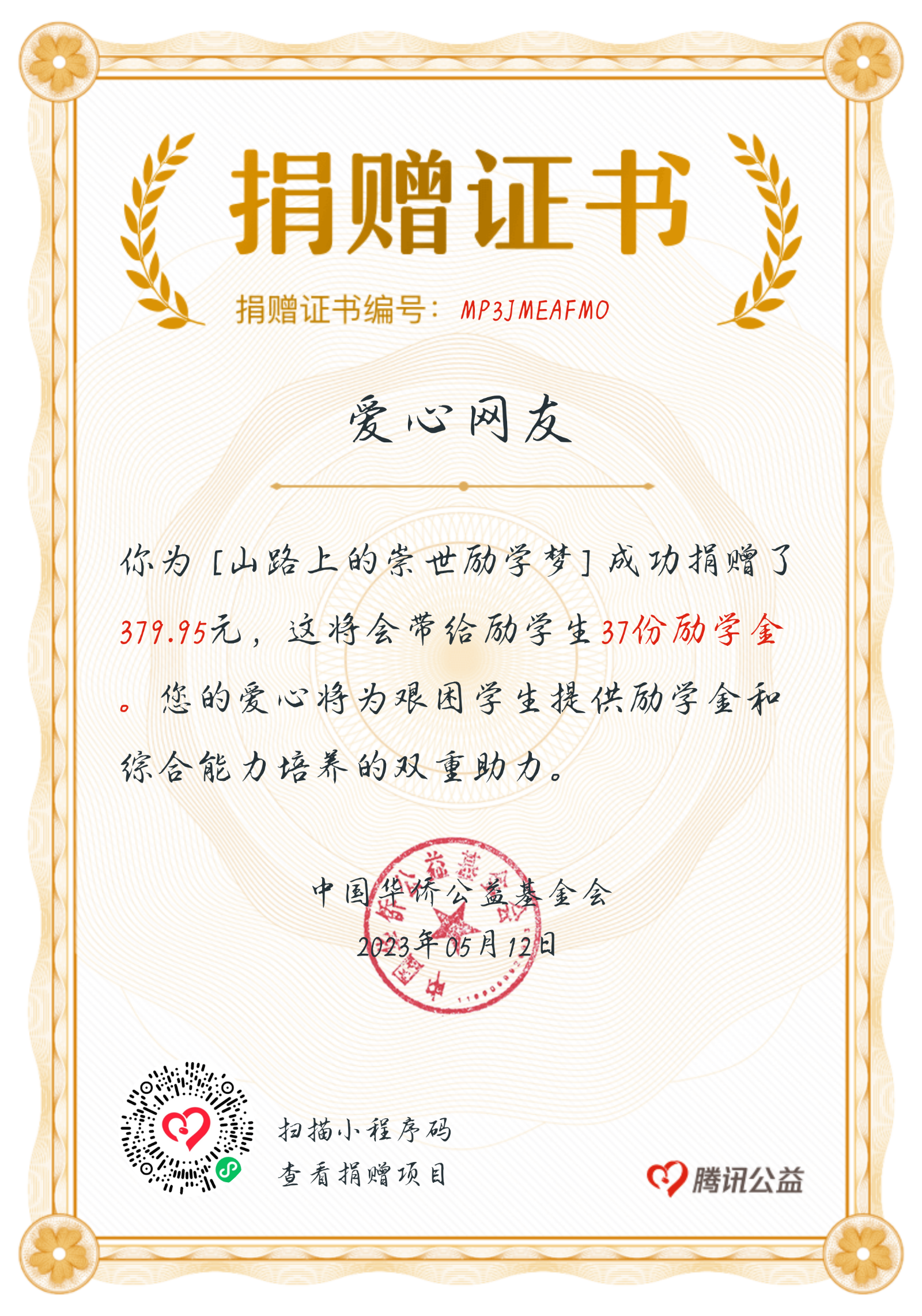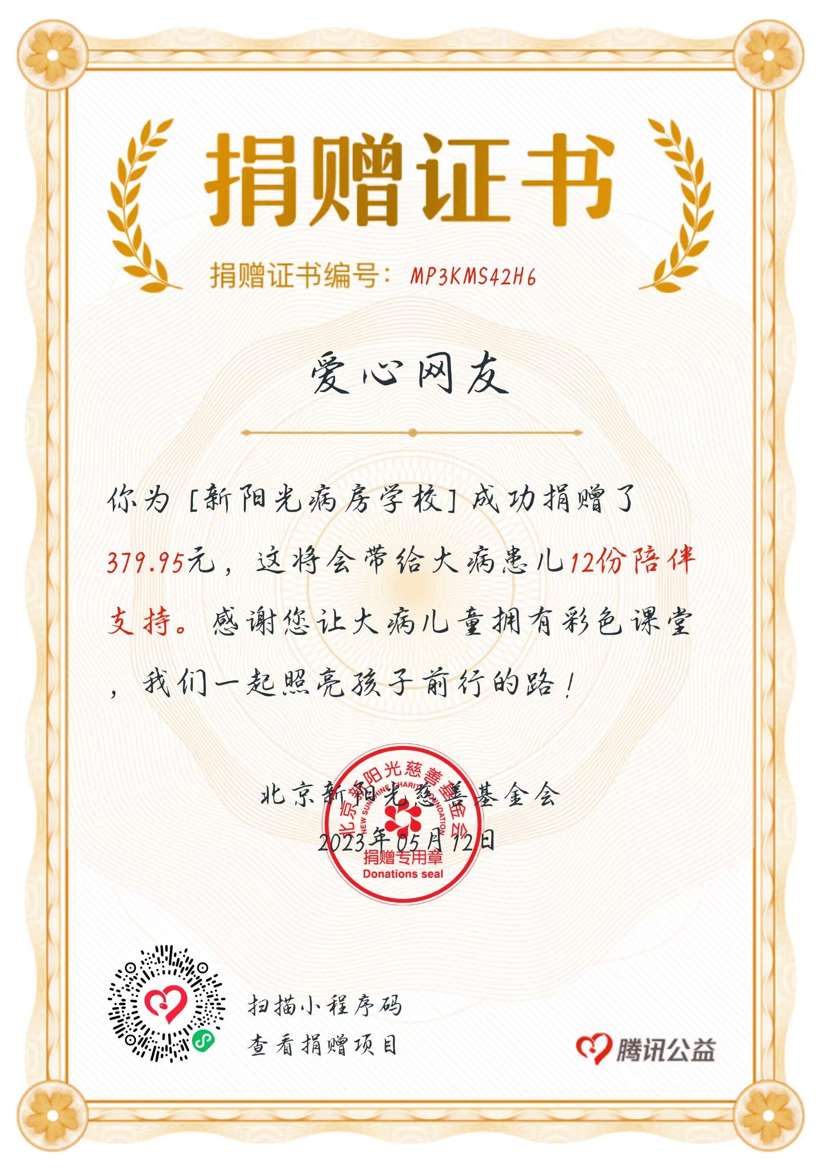 义卖有价,爱心无价。本次爱心手工捐赠活动共募得爱心款759.9元,分别向“新阳光病房学校”和“山路上的崇市励学梦”项目各捐赠379.95元,助力大病儿童拥有彩色课堂,共建艰困学生的求学之路。