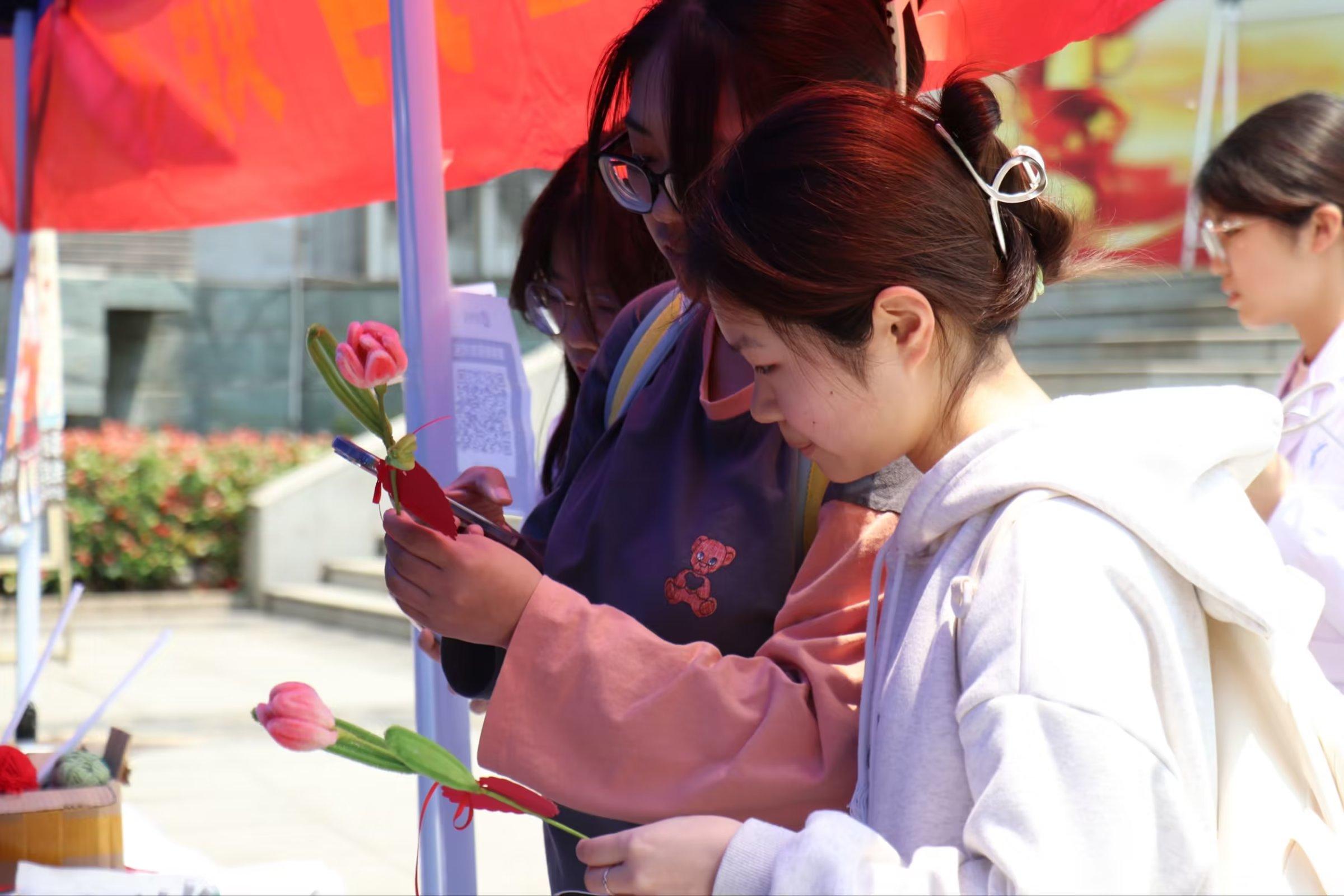 本次活动中,同学们共收集制作精美别致、创意独特的编织挂件等手工作品近百件。钻石画、奶油胶发卡以及由串珠制成的各种手链等精致的手工艺品吸引了师生纷纷驻足。大家挑选心仪的作品,奉献自己的一份爱心。