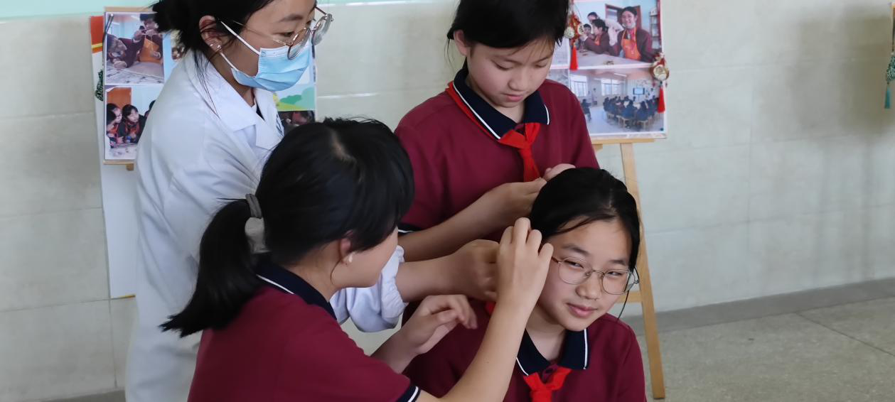 “中医文化博大精深,隋朝《诸病源候论》就有近视的记载,称之‘为能近怯远症’,到清代《目经大成》命名为近视……”在合肥市幸福路小学的中医药文化教室里,针灸推拿学院教工第一党支部王洁老师带领大学生志愿者向学生们讲授中医药防治近视相关知识,教授同学们用耳穴贴豆防治近视眼。