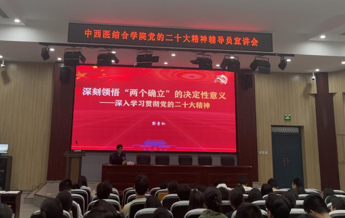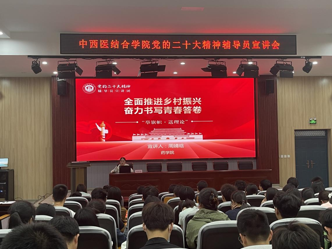 为深入学习宣传贯彻党的二十大精神,凝聚奋进力量,引导广大青年大学生坚定理想信念、勇担时代使命,5月26日下午,中西医结合学院在学院254学术报告厅开展党的二十大精神辅导员宣讲会。医药经济管理学院党委副书记彭青和、中西医结合学院党委副书记顾义俊和药学院辅导员周婧晗三位老师进行了宣讲,学院全体辅导员及2022级中西医临床医学专业学生代表参加。