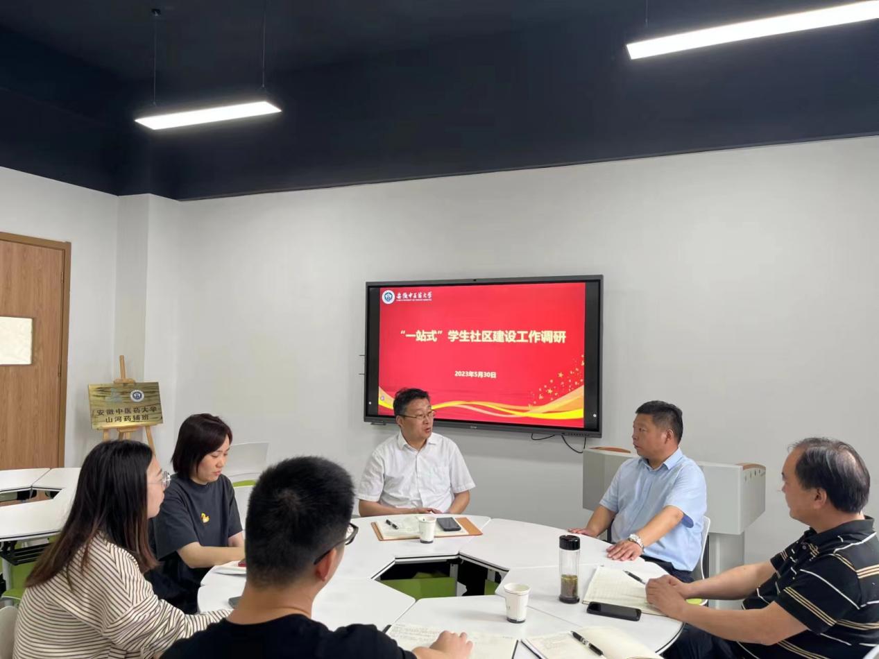 为推动学习贯彻习近平新时代中国特色社会主义思想主题教育走深走实,以调研寻找差距,助力自身发展,5月30日上午,医药经济管理学院党委书记冯鑫带领学院党政办、学工办及分团委等部门负责人到药学院开展“一站式”大学生社区建设工作专项调研,药学院党委书记胡卿、心理二级站及分团委负责人参加会议,会议由药学院党委副书记徐先韬主持。